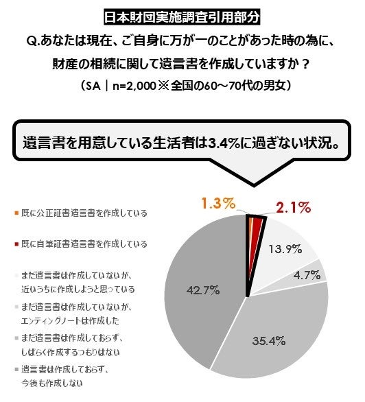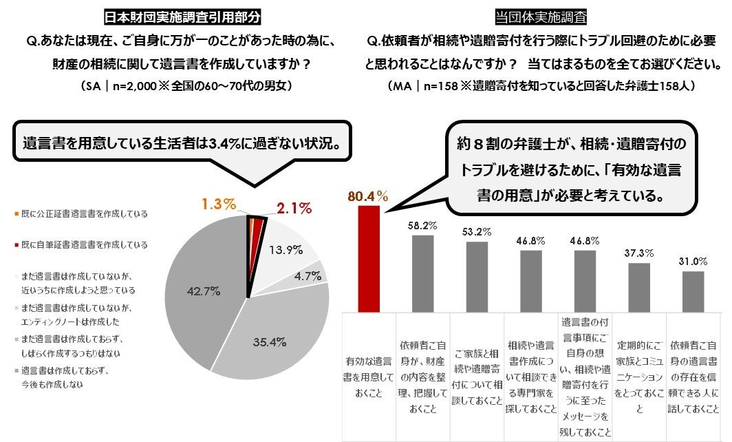 | 遺言書を用意している生活者はわずか3.4%。一方、弁護士の約8割は、相続・遺贈寄付の トラブル回避のために「有効な遺言書の用意」が必要と回答し、遺言書への意識に乖離あり。 |