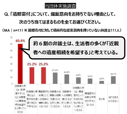 これまで「遺贈寄付」の相談実績がある弁護士に対し、「遺贈寄付」に対する提案意向を伺うと、約7割(70.2%)の弁護士が積極的な提案意向はないと回答。弁護士は「遺贈寄付」の提案に対して慎重な姿勢であることが見受けられます。その理由を問うと、「依頼者の多くは、配偶者や子どもなど近親者への遺産相続を希望すると思っているため(60.4%)」が最も多くなりました。生活者が遺贈に抱く印象と、サポートする弁護士の意識にズレがあると考えられます。