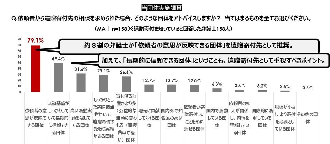 - 弁護士の約8割が、「依頼者の意思が反映できる団体」を遺贈寄付先として推奨。