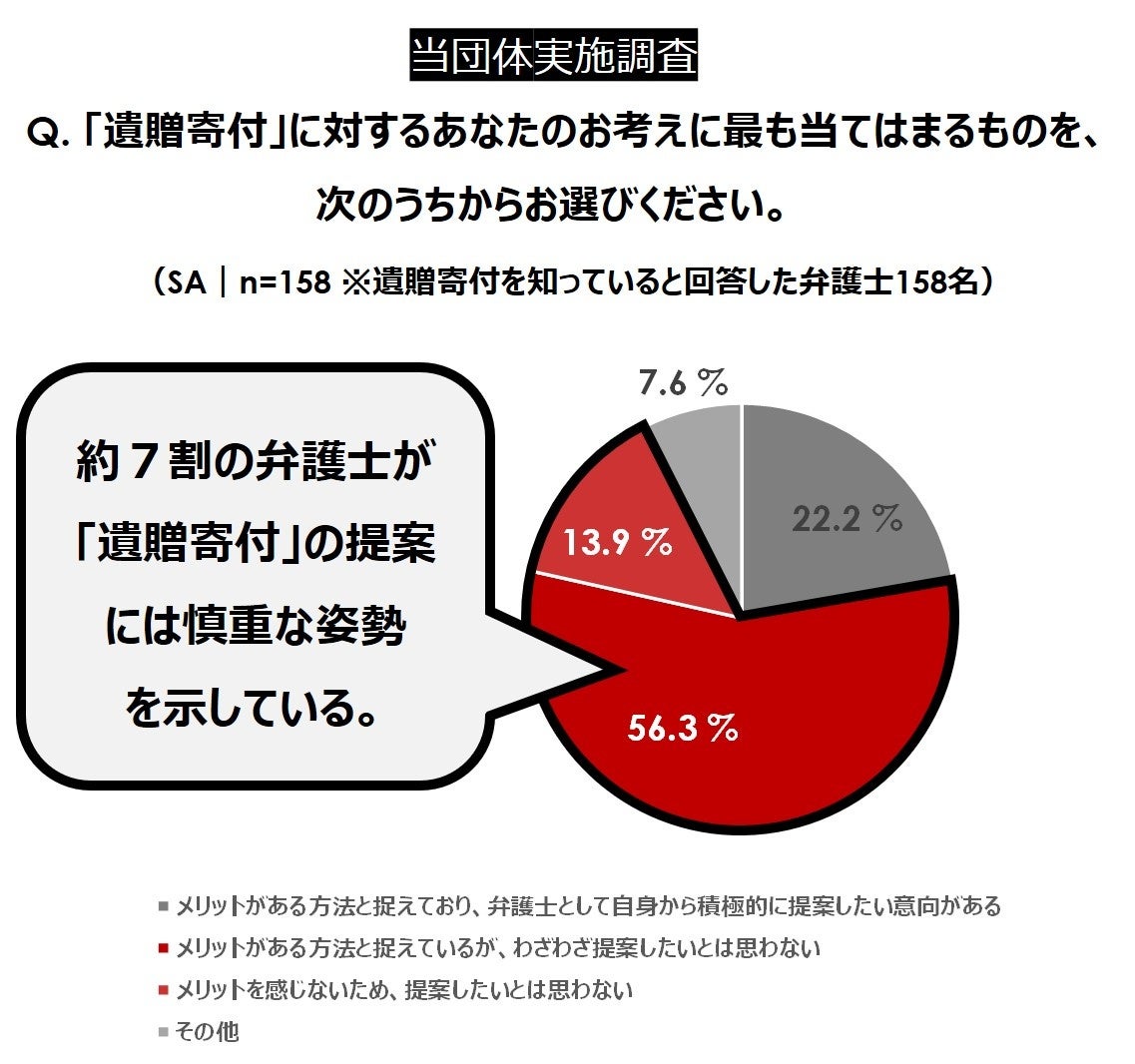 - 一方、弁護士の半数以上が「遺贈寄付」に関心を寄せる層は10%にも満たないと推測。