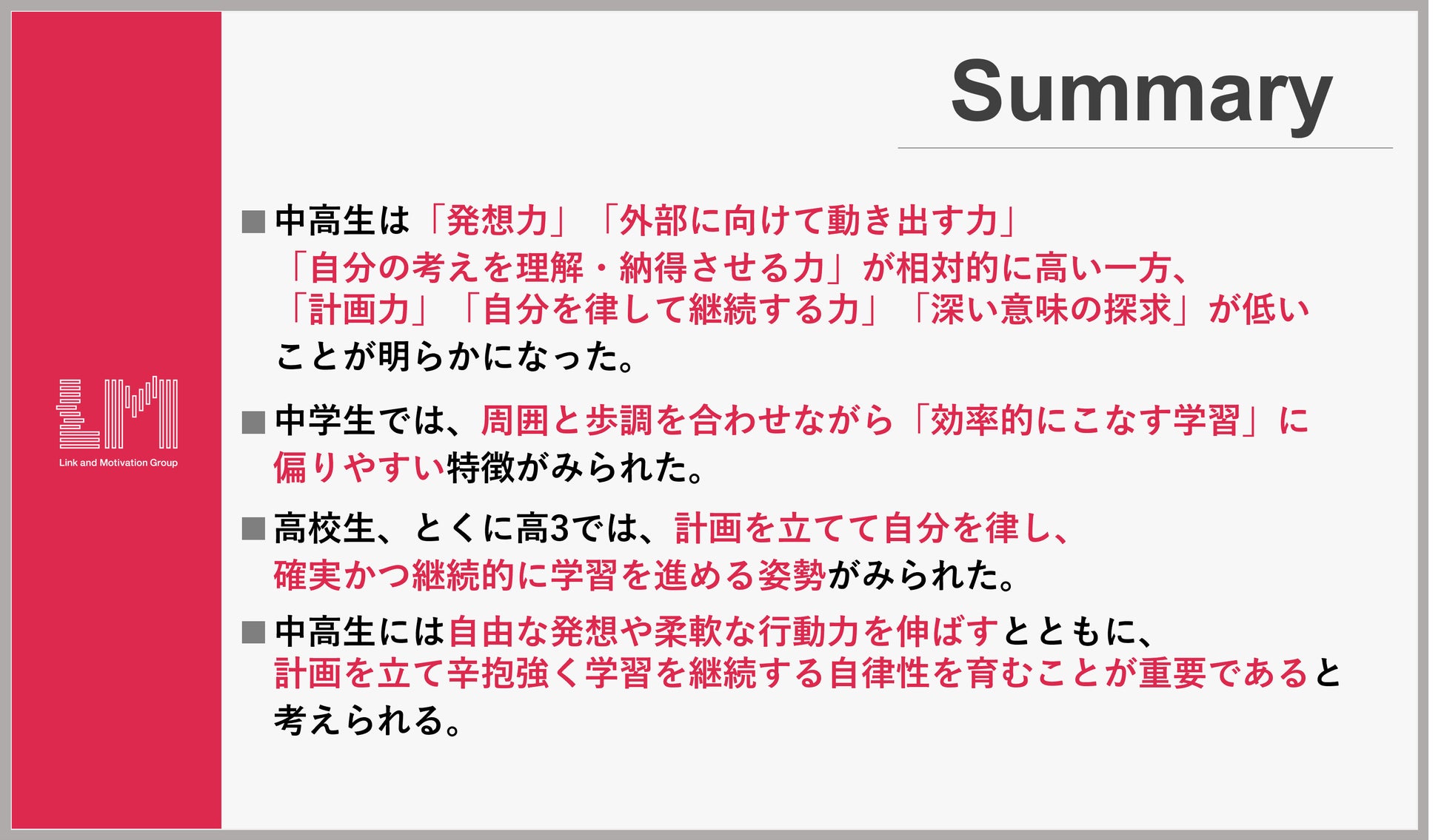 今回の結果から、中高生が持つ発想力や対人面での強みが、周囲と足並みをそろえようとする傾向の強さから十分に発揮されず、推進力や意味探求の低下につながっている点が課題として示唆されました。