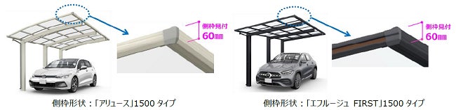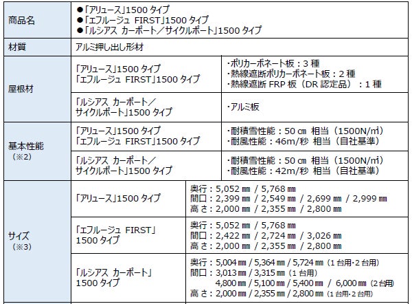 このような社会背景に対し、積雪50㎝相当のカーポート商品を拡充することで、地域・ニーズに合わせた選択肢の幅を持たせ、1ランク上の安全・安心を求める需要を喚起します。「アリュース」1500タイプは、アール型屋根形状による柔らかなフォルムで、和風・洋風問わず幅広い住宅デザインに対応するカーポートです。「エフルージュ FIRST」1500タイプは、フラット屋根形状で、昨今のフラット基調の住宅デザインにマッチする洗練されたデザインのカーポートです。共に、屋根材はポリカーボネート板で、50㎝相当の耐積雪性能と46m/秒の耐風性能で幅広い地域に対応し、使い勝手の良い片側支持タイプをラインアップしています。