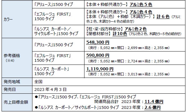 | <「アリュース」 「エフルージュ FIRST」1500タイプの主な商品特長> ●高性能・高品質を実現:強度が必要な柱や梁に「高強度T6アルミニウム合金」を採用 ●高い意匠性の枠形状:スリム&シンプルなアール形状と、フラット&シャープで高級感を演出 <「ルシアス カーポート/サイクルポート」1500タイプの主な商品特長> ●オプションの充実:オプションの充実で、更に美しく・機能的に ●幅広い用途での活用:カーポートとしての用途以外にも、ライフスタイルに合わせた活用が可能 <共通の商品特長> ●品質確保:施工の簡易化による高い施工品質の確保 |