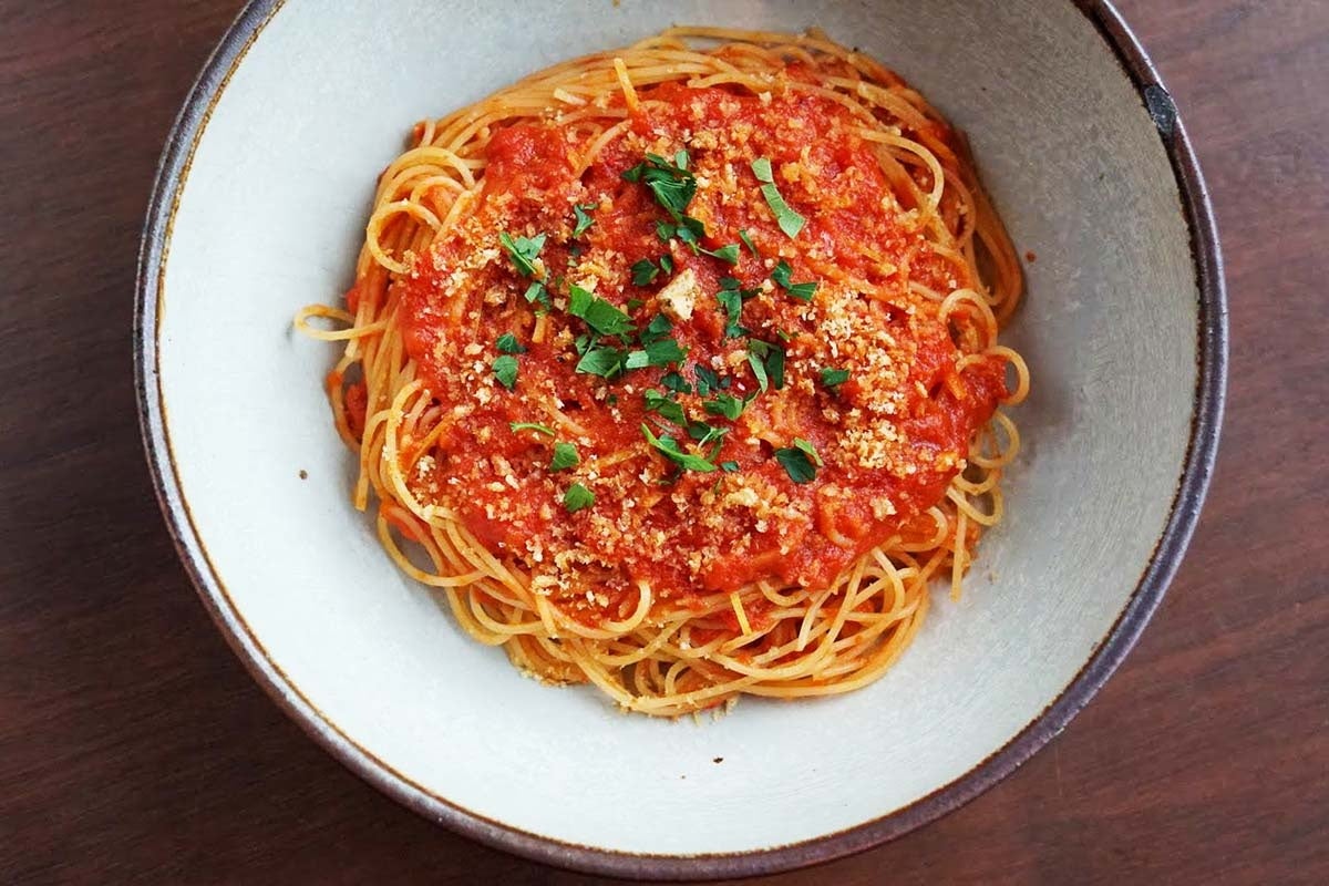 ワンダーテーブルが自社で肥育したいわて山形短角牛を粗挽きにし、旨味と食感を最大限に味わえるように赤ワインや香味野菜、トマトと共に仕上げました。生パスタのタリアテッレはもちもちとした食感が特徴です。