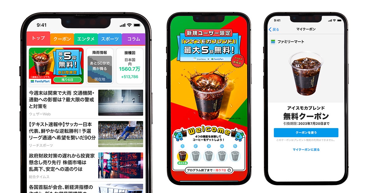 第一弾は、新規ユーザーを対象に、SmartNewsアプリ内で設定されたミッションをクリアするとファミリーマート新商品「アイスモカブレンド」の無料クーポンを最大5杯分提供