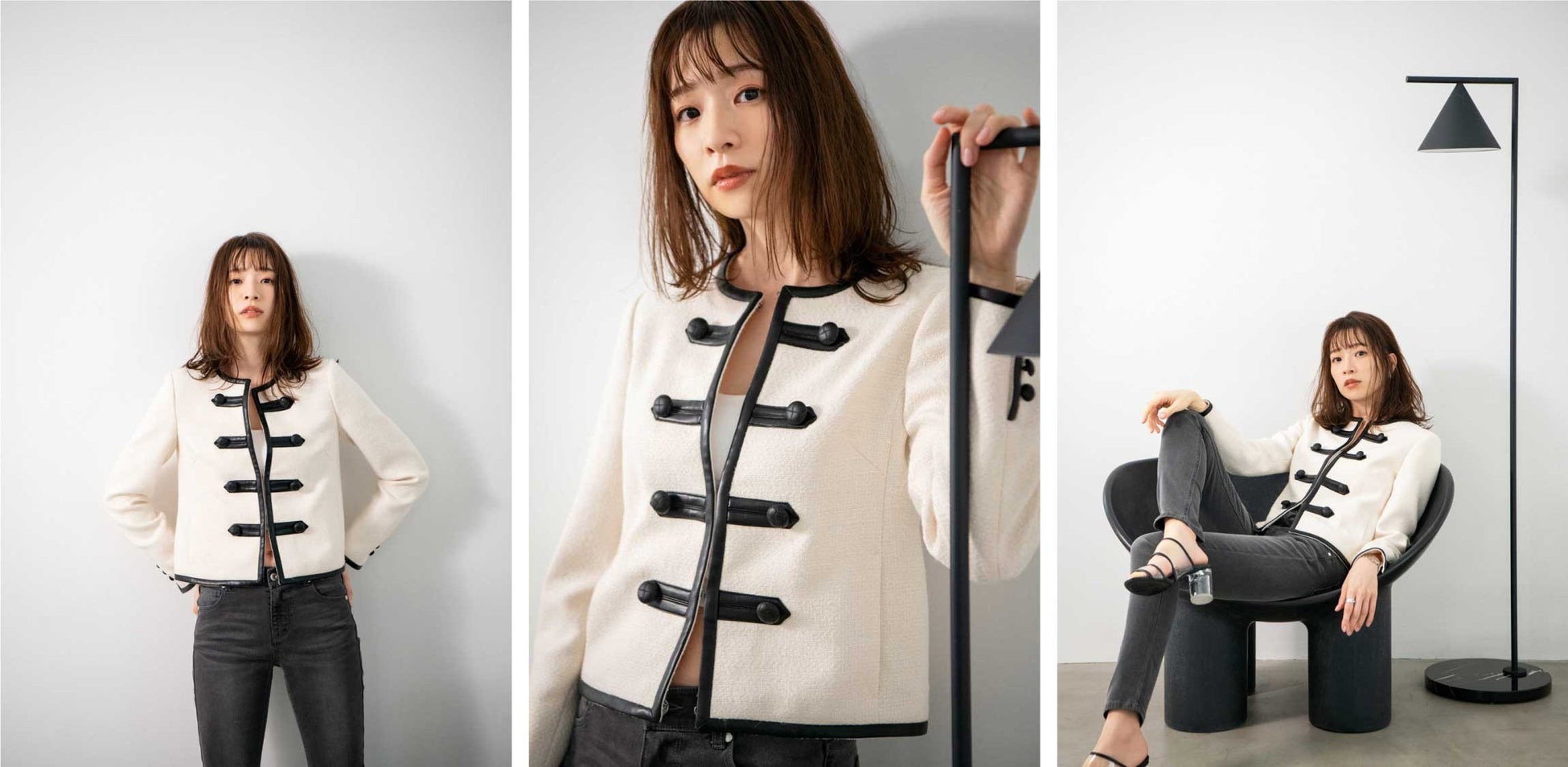 今回のコラボレーションは、モデル兼ファッション&美容系YouTuberの石井亜美氏との初の取り組み。大の「LOVELESS」ファンを公言する石井さんが、彼女自身のファッションやスタイリングへのこだわりを「LOVELESS」のクリエーションと併せ、来春リアルに着たいツイードジャケット、ニットの2型を商品化しました。