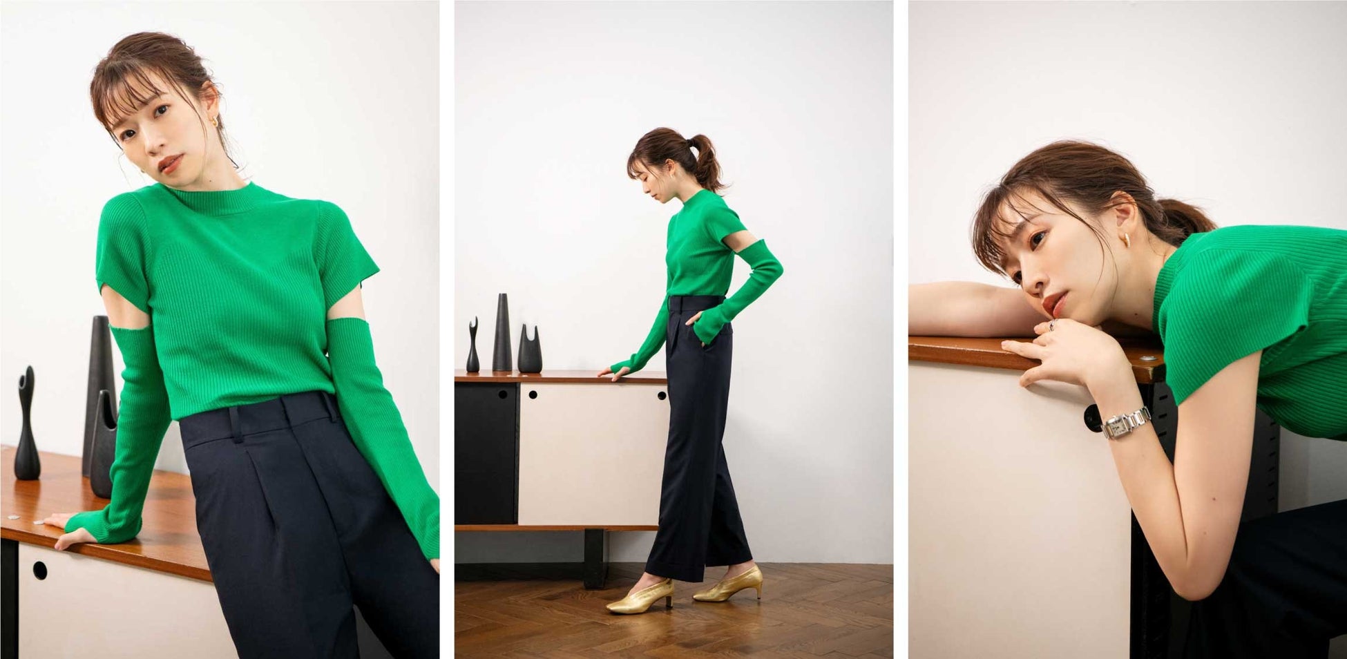 ヘルシーな肌見せが叶うアームウォーマー付きニット。アームウォーマーはボタンで取り外しができるので、肌見せニットとしての着用をはじめ、取り外して半袖ニットとして、またはアームウォーマーのみを他の洋服と組み合わせてスタイリングできるのが特徴です。