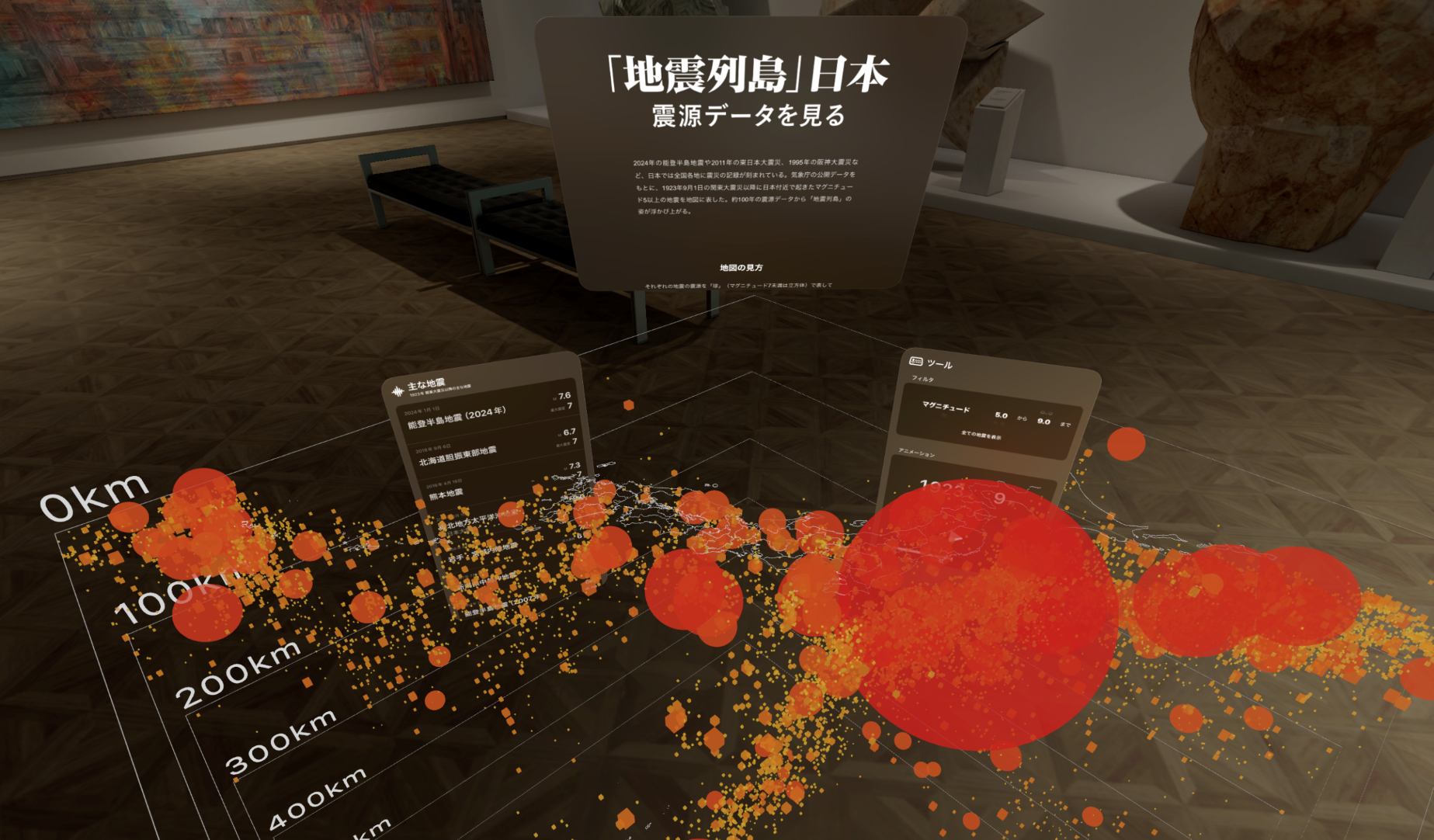 リリース企画として、日経電子版のビジュアルデータコンテンツ「『地震列島』日本」を日経空間版用に再構成した3Dコンテンツを公開します。このコンテンツはアプリをダウンロードすればどなたでもご覧になれます。気象庁のデータをもとに、直近約100年におきた地震を3D空間上にマッピング。片手や両手で拡大・縮小・回転でき、様々な角度からこれまでに発生した地震の規模や震源などを閲覧できるようにしました。3D空間を最大限に活用したコンテンツを順次提供予定です。