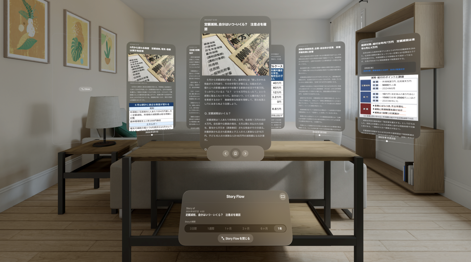 新聞の全てのページが空間上に浮かび俯瞰できる全く新しいUI(ユーザーインターフェイス)を提供します。ビジョンプロが持つ視線追跡の機能を活用し、読みたい紙面に視線を合わせて指でタップすると選んだ紙面が手前に近づき、記事の見出しやテキストを拡大できます。広大な3D空間を活用したUIを通じて、これまでに類を見ない立体的でバーチャルな新聞紙面をお届けします。(日経電子版有料会員限定)※特許出願中