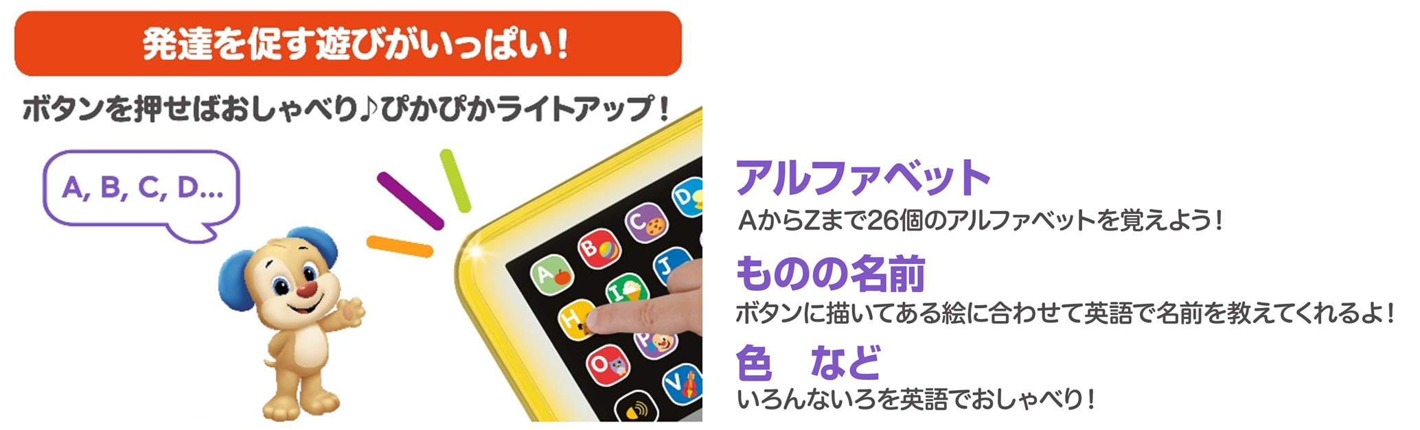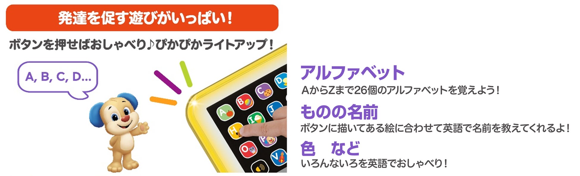 1歳からのはじめての英語にぴったりの知育おもちゃ「えいごで学ぼう!わんわんのABCタブレット」が8月下旬より新発売 ~パパとママのまねっこができる、お子様専用タブレット~