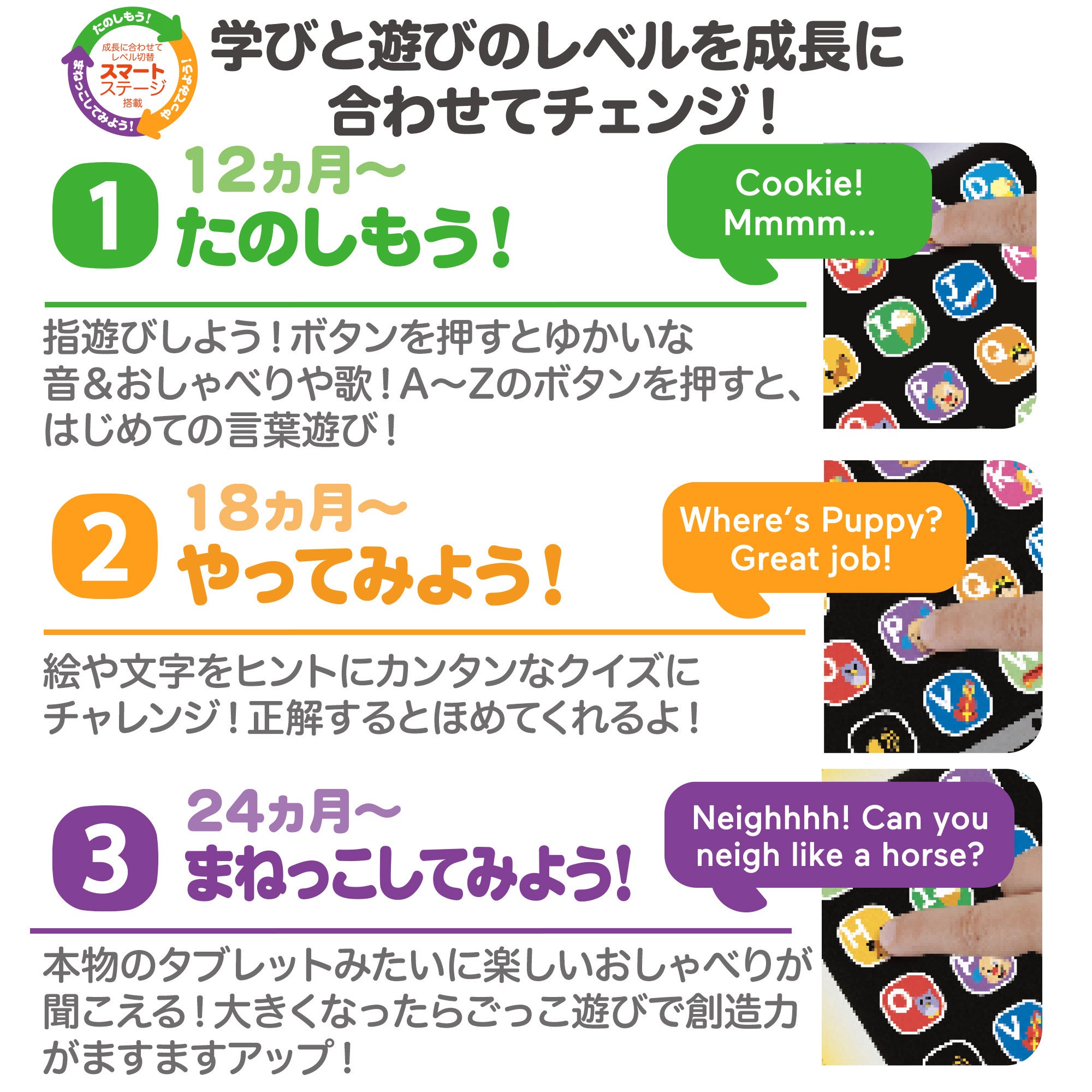 28個の「アプリ」ボタンを押すと、100以上の歌、音、フレーズが流れアルファベットや身近なもの、動物などを楽しく学ぶことができます。お子様の成長に合わせてレベルが変えられる「スマートステージ」機能を搭載しており、お子さまの発達に最適なレベルを選択し、長く遊んでいただけます。