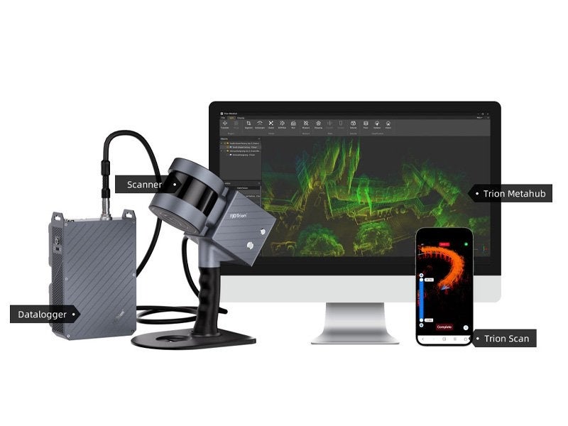 16個のLiDARを搭載したスキャナーは1.8kgと軽量で、2.2kgのデータロガーと合わせても、どこでも手軽に手持ちでスキャンが可能です。長時間のスキャンや車・船などへの搭載にも対応。点群をリアルタイムで確認できるスマートフォンアプリや点群後処理ソフトもリリース予定です。