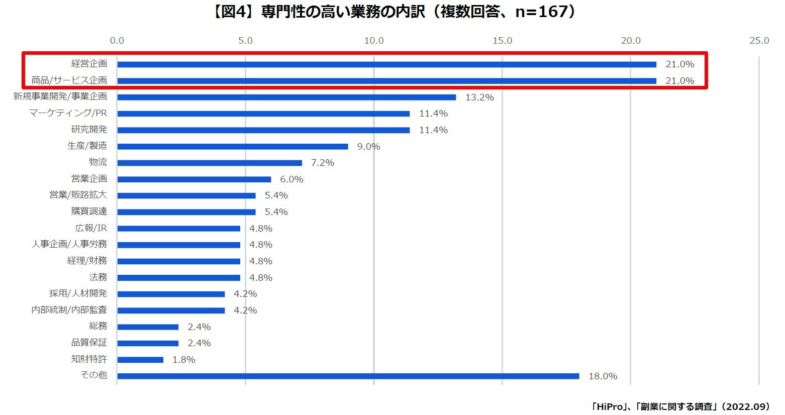 副業における業務内容と労働時間を聞いたところ、業務内容については「専門性の高い業務」が8割を占め、さらに1か月あたりの副業に従事する労働時間は20時間以上と回答した人が半数以上という結果になりました。副業で年間300万円以上稼ぐ副業者は、専門性が高い業務に一定以上の時間を費やして対価を得ていることが伺えます。なお、具体的な業務内容としては「経営企画」と「商品/サービス企画」が共に21.0%と最も多く、次いで「新規事業開発/事業企画」(13.2%)、「マーケティング/PR」(11.4%)となりました。(【図3】・【図4】・【図5】参照)