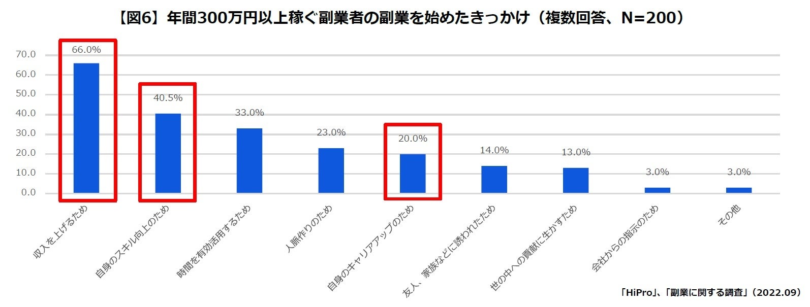副業を始めたきっかけで最も多かった回答は「収入を上げるため」(66.0%)でしたが、「自身のスキル向上のため」(40.5%)や「自身のキャリアップのため」(20.0%)といった回答も多く、“3つのアップ”を目的にする人が多いことがわかりました。(【図6】参照)