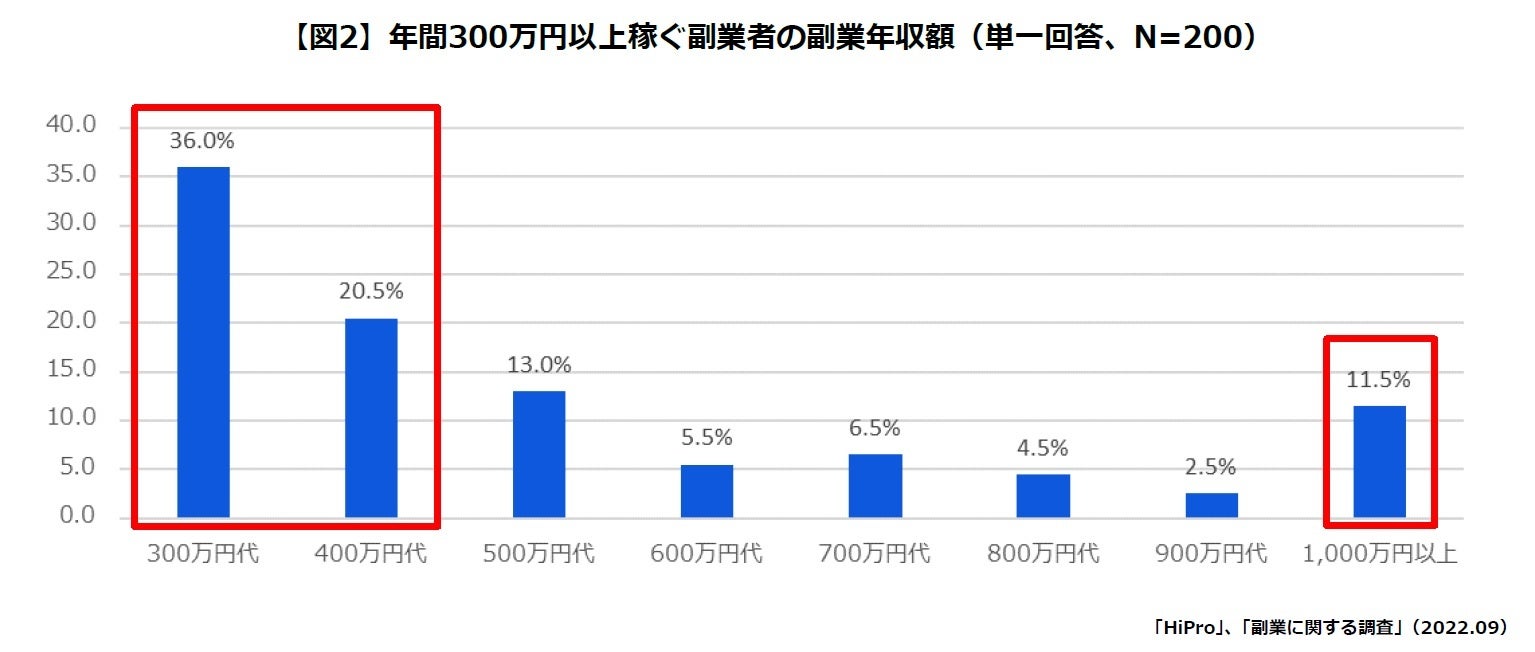 300万円以上の副業年収がある副業者にその額を尋ねたところ、300万円代が36.0%、400万円代が20.5%と、全体の半数以上(56.5%)を占める結果になりました。一方、年間1,000万以上稼ぐ層が11.5%も存在することが明らかになりました。(【図2】参照)