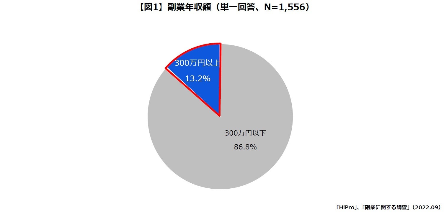 今回の調査実施にあたり、対象者を絞り込むために、副業者に「どの程度の副業年収があるか」を聞いたところ、副業年収額が300万円以上と回答した人が全体の13.2%という結果になりました。(【図1】参照)