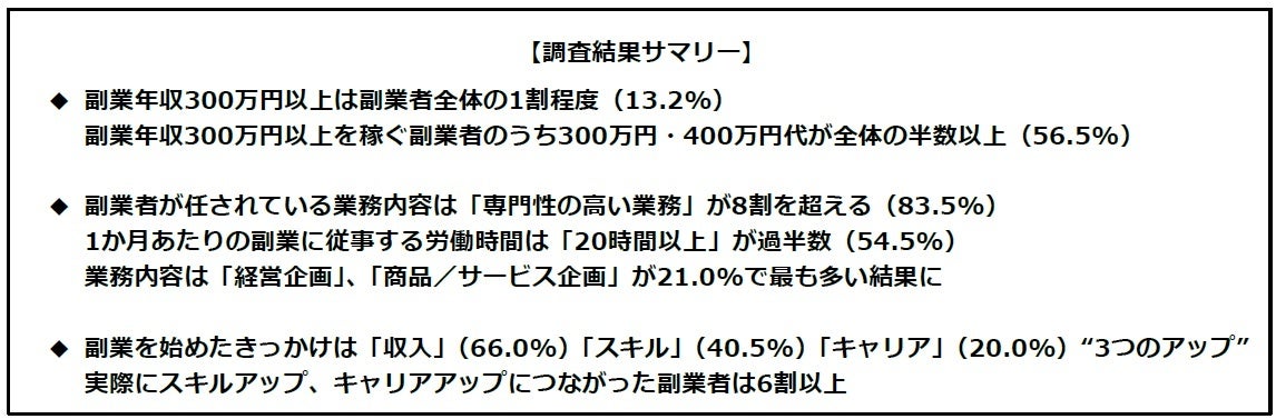 そこで今回は、今話題となっている「副業収入300万円」に着目し、副業年収300万円以上の方の副業実態調査を行う運びとなりました。
