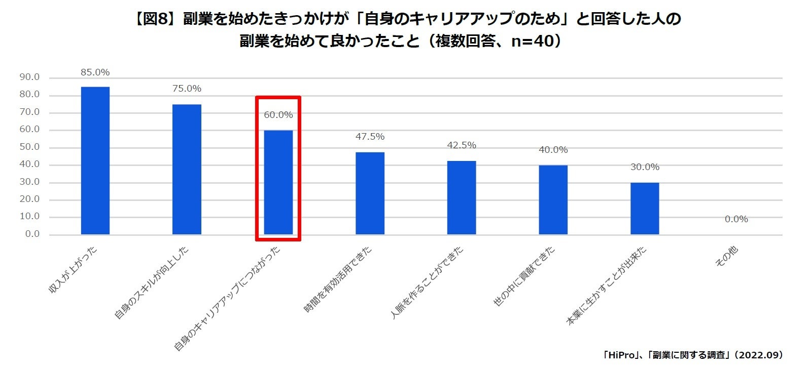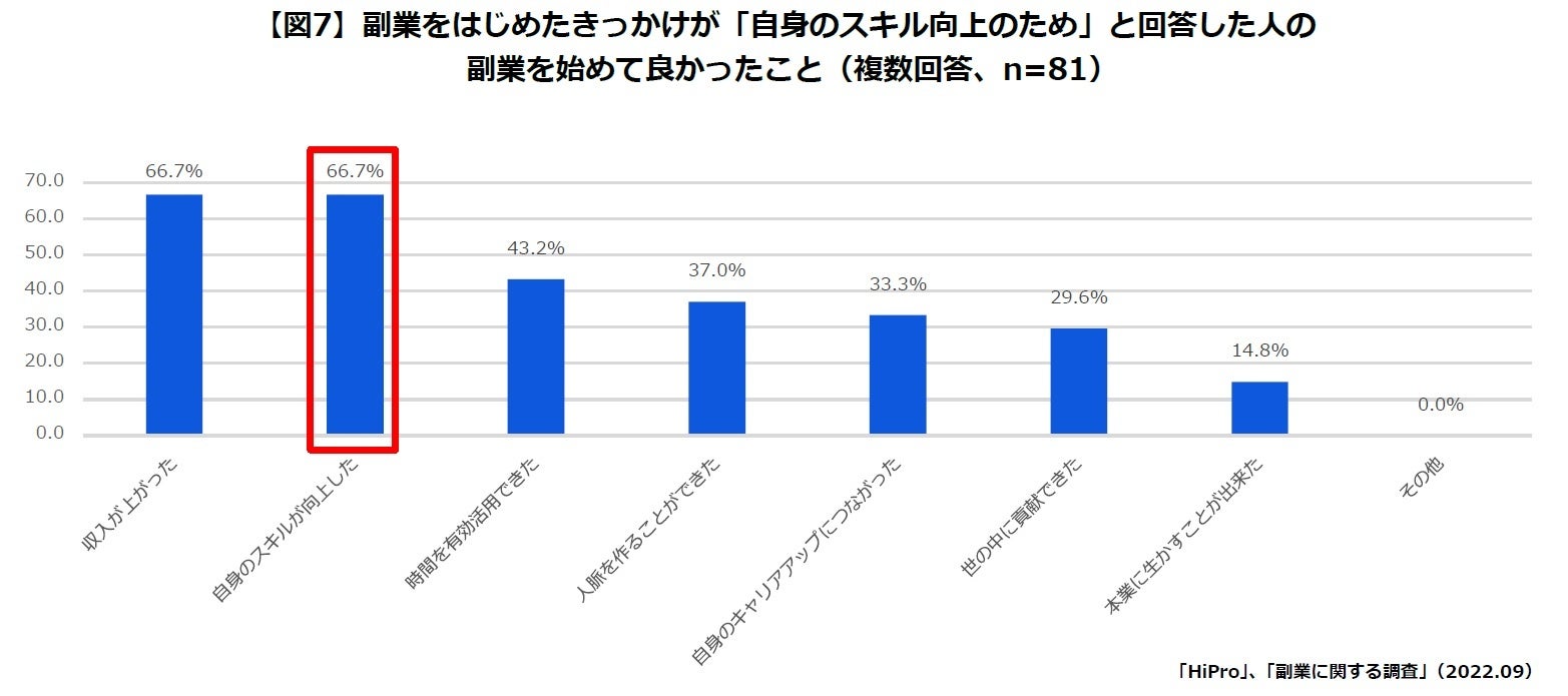 副業して良かったことを聞いたところ、「スキルアップ向上がきっかけ」と回答した人の66.7%、「キャリア向上がきっかけ」と回答した人の60.0%が、実際にアップにつながったと回答しています。(【図7・図8】参照)