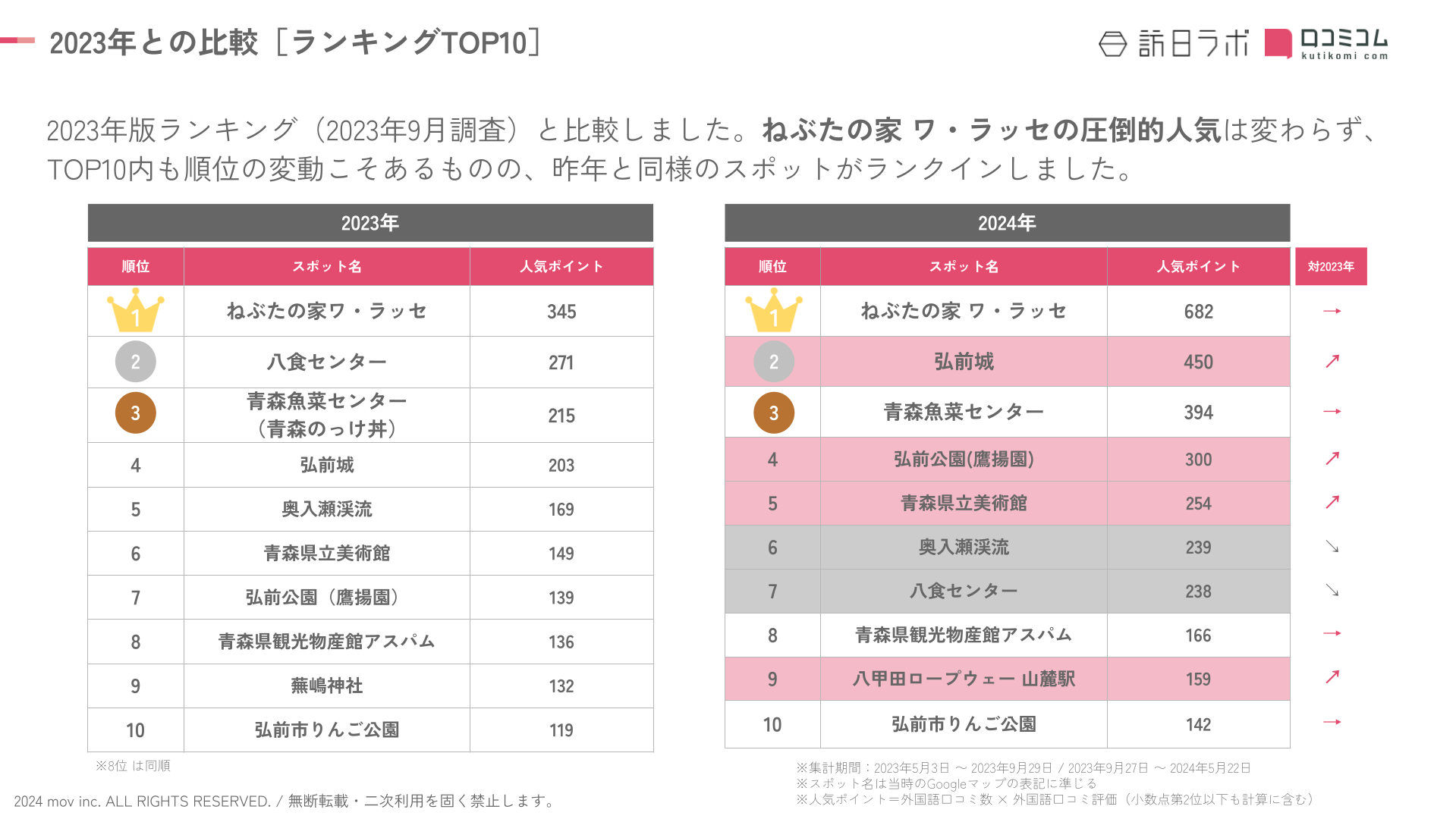 ねぶたの家 ワ・ラッセの圧倒的人気は変わらず、TOP10内も順位の変動こそあるものの、昨年と同様のスポットがランクインしました。訪日客からの根強い支持がうかがえます。