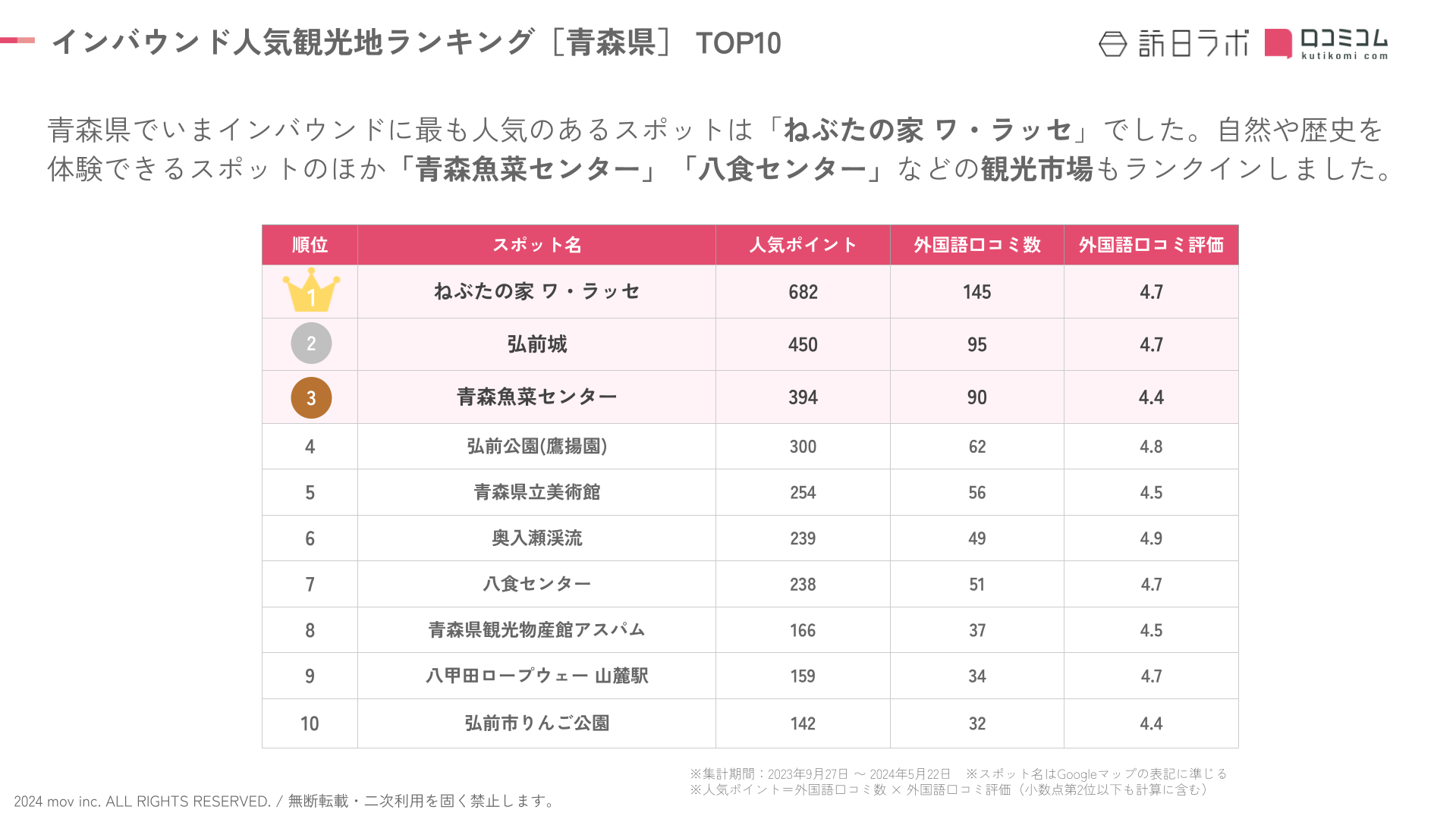 【独自調査】2024最新:外国人に人気の観光スポットランキング[青森県編]1位は2年連続で「ねぶたの家 ワ・ラッセ」!| インバウンド人気観光地ランキング #インバウンドMEO