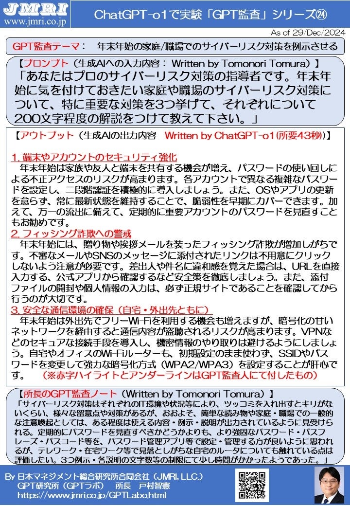 ChatGPT「o1」が厳選した「年末年始の家庭/職場のセキュリティ対策3選」: GPT監査レポート第24号の公開(by GPT監査人 戸村智憲)【日本マネジメント総合研究所合同会社】