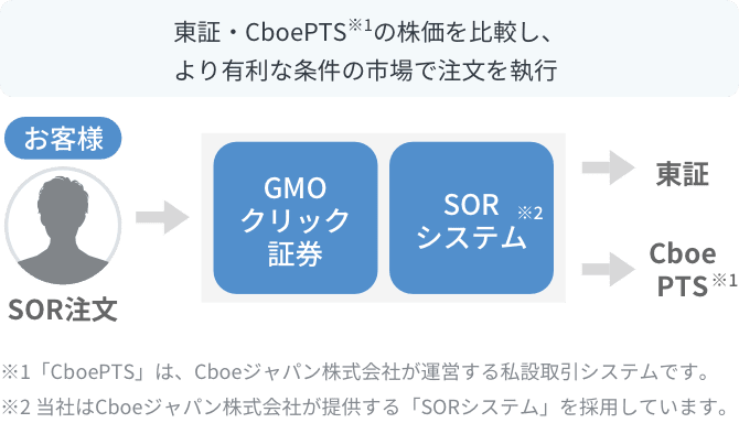 当社のSOR注文サービスは、東京証券取引所とCboePTS※1の第1市場および第2市場で提示されている気配値を監視し、東証の最良気配よりも有利な価格、または同値でCboePTS※1に発注することにより、自動で最も良い条件の市場へ注文を取次ぎします。本サービス導入により、より優良な価格での売買執行が可能となりますので、この機会にぜひ、当社での株式取引をご検討ください。