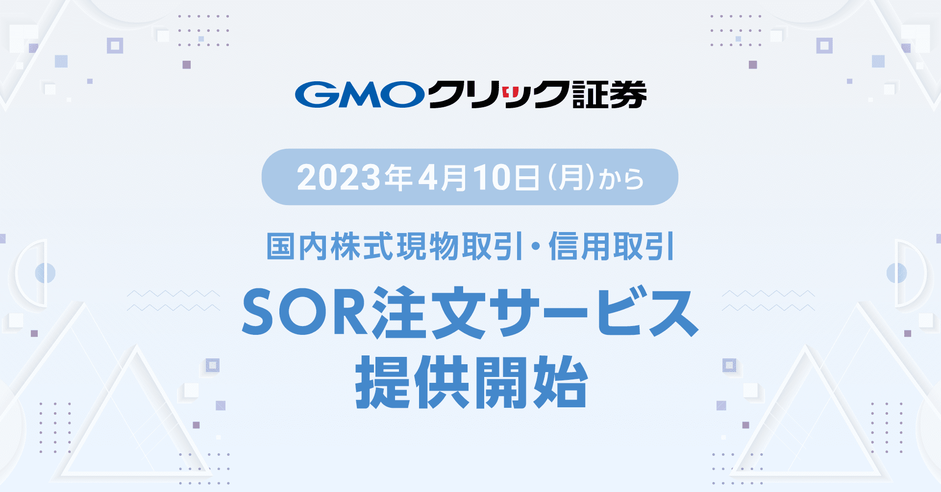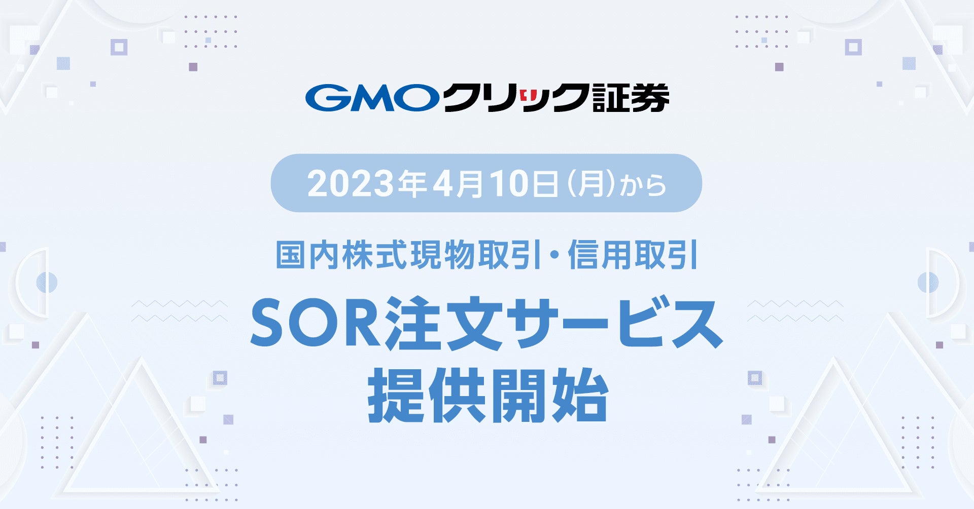 GMOインターネットグループのGMOフィナンシャルホールディングス株式会社の連結会社で、金融商品取引業を営むGMOクリック証券株式会社(本社:東京都渋谷区、代表取締役社長:鬼頭 弘泰、以下:当社)は、2023年4月10日(月)より、SOR注文サービスの提供を開始しますので、お知らせいたします。