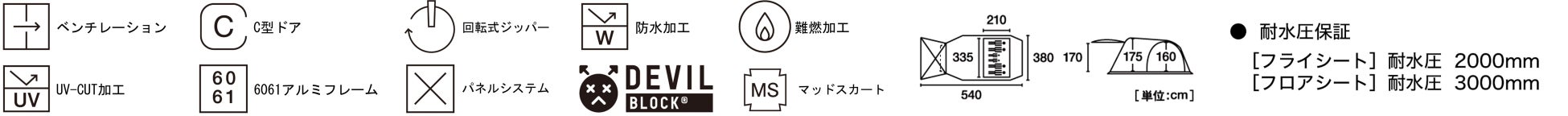 構成 : フライシート、インナーテント、インナーフレーム、リッジフレーム、パネルフレーム、キャノピーポール、ロープ、収納バッグ、フレーム用収納袋、ペグ、ハンマー、小物袋