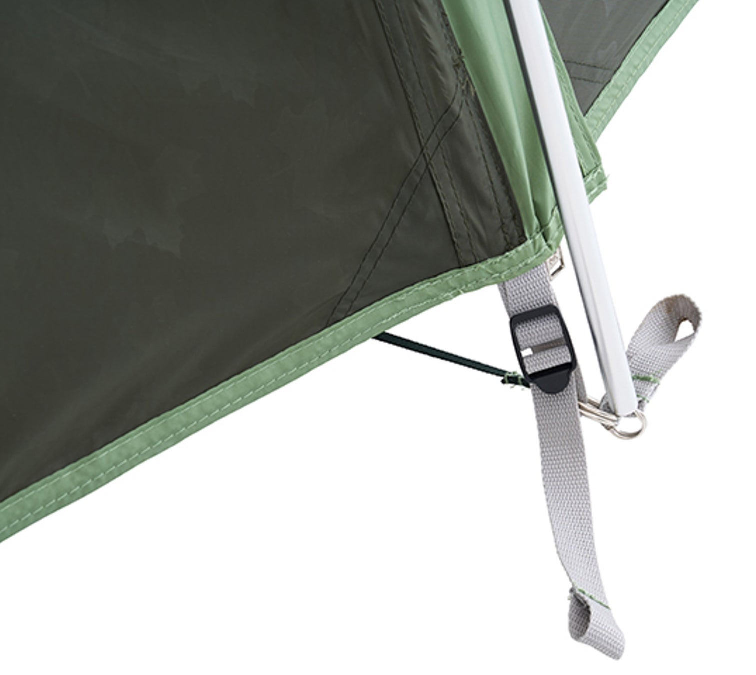 LOGOS独自のSUPPORT BELT SYSTEM採用。フレームをリングピンに差し込む部分に調節可能なベルトを設けることで、設営時のはベルトを緩めると簡単にフレームを差し込むことができ、差し込んだ後はベルトを短く締めると簡単かつ余分な力いらずでテントを張ることができる。