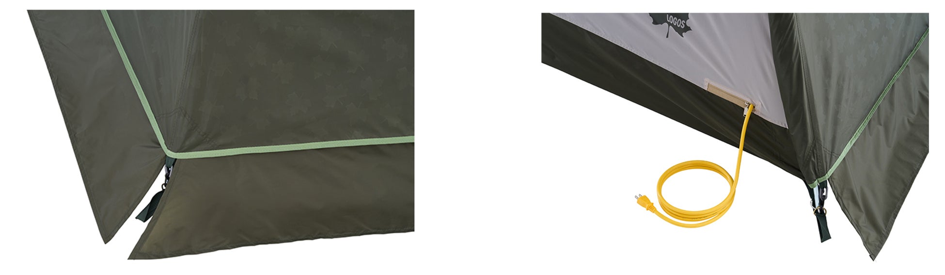 冷気や雨、虫の侵入を防ぐマッドスカートを全面に装備。ペグが打てるループが付いているので風のバタつきも防げる。インナーテントの下部には、ジッパー付きで冷気を遮断できる電源コードの取り込み口も完備。