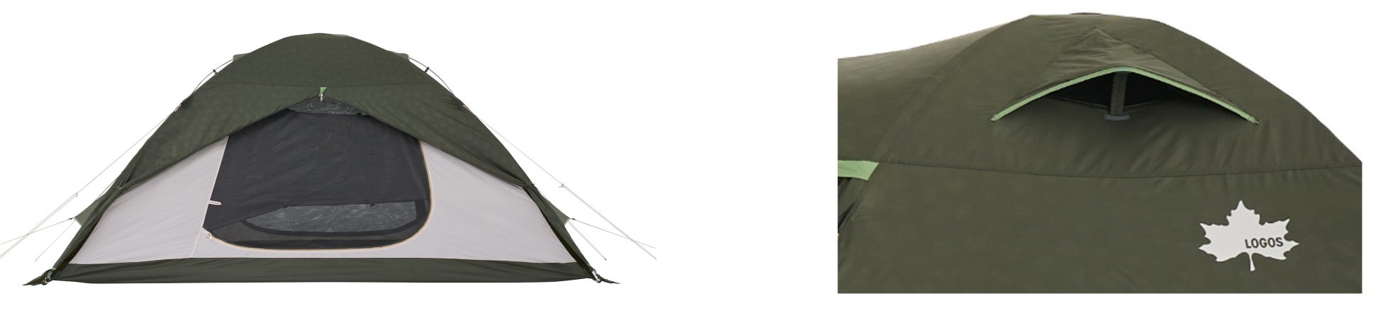 LOGOS独自の「PANEL SYSTEM」を搭載しており、テント前面にクロス状のフレームを組み込んだ「筋交い構造」によってフルクローズ時の強度が向上するほか、2本のポールで支えるとテントの一体化したタープになるので、居住空間を拡大できます。また、キャノピー使用時には天井部分にランタンを吊り下げることもできるうえ、Xの中心を起点に湾曲した構造は雨天時の雨だまりを防ぐこともできます。