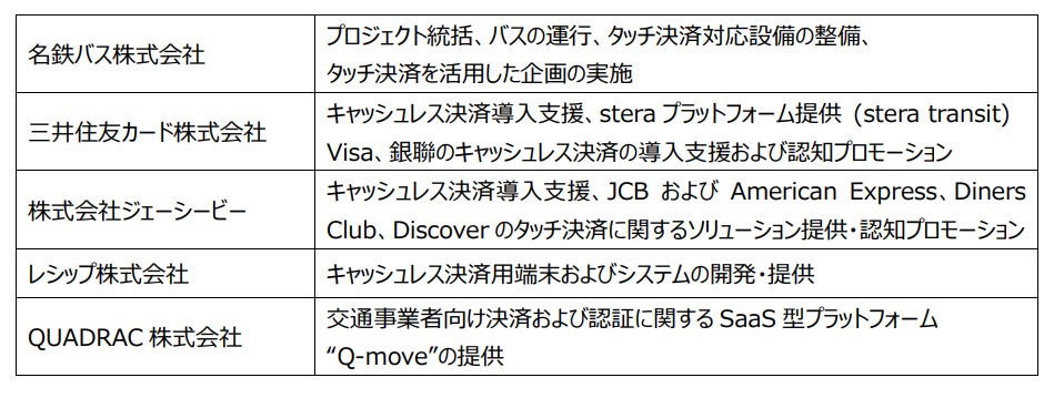 名鉄バス株式会社(本社:愛知県名古屋市、代表取締役社長:瀧 修一)、三井住友カード株式会社(本社:東京都江東区、代表取締役社長:大西 幸彦)、株式会社ジェーシービー(本社:東京都港区、代表取締役兼執行役員社長:二重 孝好)、レシップ株式会社(本社:岐阜県本巣市、代表取締役社長:杉本 眞)、QUADRAC株式会社(本社:東京都港区、代表取締役社長:高田 昌幸)、は2024年11月1日に、名古屋市内と中部国際空港を結ぶ空港バス、セントレアリムジン(伏見・栄⇔中部国際空港)において三井住友カードが提供する公共交通機関向けソリューション「stera transit」を活用した、タッチ決済対応のカード(クレジット、デビット、プリペイド)や、カードが設定されたスマートフォン等による乗車サービスを開始することを、発表します。