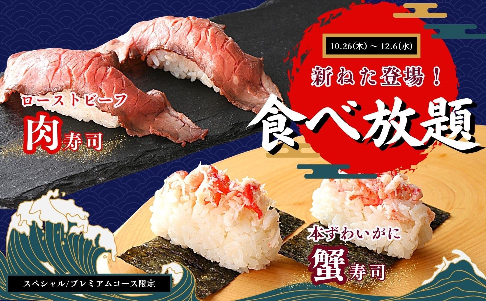 この度、2023年10月26日(木)~ 2023年12月6日(水)のスペシャルコース以上のご利用にて、価格はそのまま、寿司食べ放題に『新ねた』が登場いたします!!