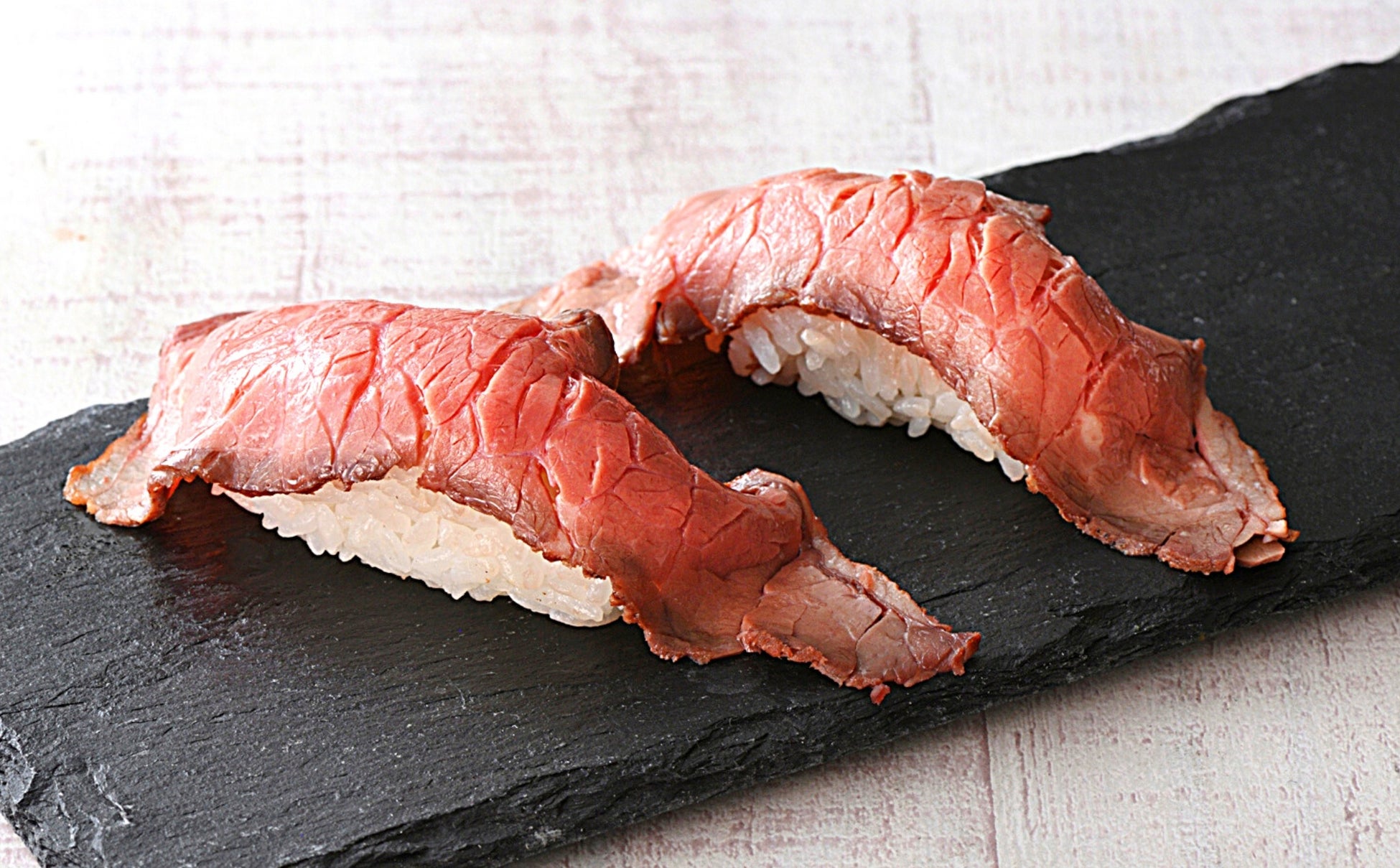 美味しさが満ちる贅沢な一品!低温焼成でじっくりと肉の旨みを閉じ込めたローストビーフとさっぱり酢飯が相性抜群の『肉寿司』。