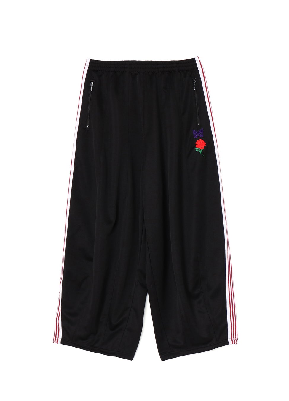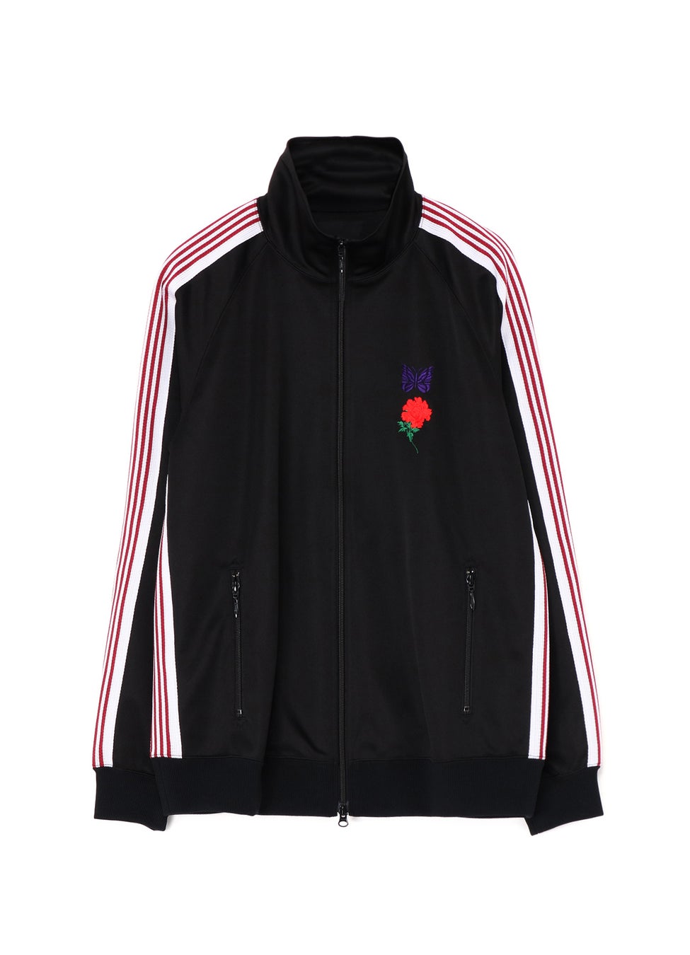 伸縮性や通気性に富んだポリエステルジャージ素材の黒いボディに、<NEEDLES>を象徴する紫の蝶とヨウジヤマモトのアイコニックなモチーフでもある牡丹の花の刺繍を縦に配置したコラボレーションならではのアイテムです。