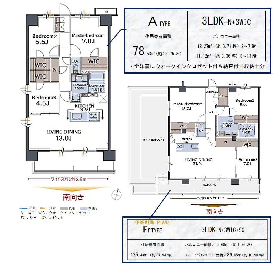 明るく開放的な全邸南向き。選べる65㎡超~125㎡超の広さ、最上階に広々ルーフバルコニー付プレミアムプラン