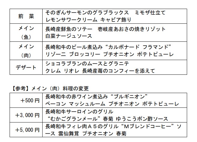 4種類のディナーコースをご用意いたしました。 そのぎんサーモンや長崎産の鮮魚、長崎和牛など、