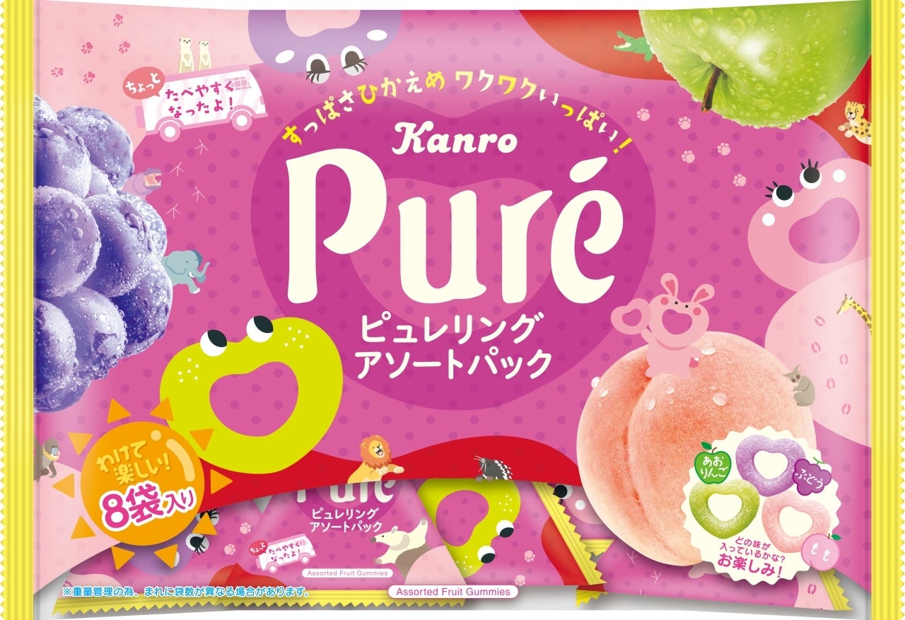 『ピュレグミ』は、2002年の発売以来、幅広い世代の方からご支持いただいているカンロの人気商品です。フルーツのおいしさを引き出す“すっぱいパウダー”と独自の“果肉食感”により、噛むほどにフルーティーな甘ずっぱいおいしさが広がり、食べた瞬間こころが晴れるように、ちょっとハート(気持ち)があがるハート型のグミです。