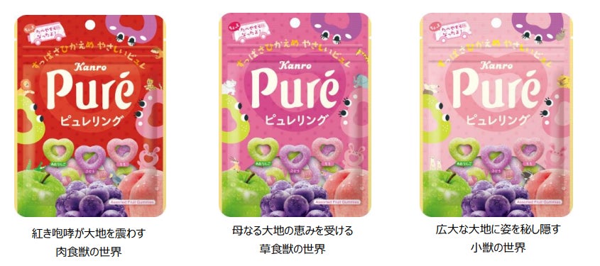 リニューアルにともない、パッケージも一新。“大人Kawaiiどうぶつの世界”をテーマとした新たなデザインでお届けします。「ピュレリング」「ピュレリングパーティーパック」のカラーは3色展開で、肉食獣・草食獣・小獣が生きる世界の大地の色味を表現。ライオンやチーター、ナイルワニなどのモチーフを施した「~紅き咆哮が大地を震わす~肉食獣の世界」は獰猛な世界を表す深紅色、キリンやシロサイ、カバがいる「~母なる大地の恵みを受ける~草食獣の世界」はやさしさに包まれるピンク色、アルマジロやミーアキャットのイラストをちりばめた「~広大な大地に姿を秘し隠す~小獣の世界」は広大な大地をイメージしたサーモンピンク色のパッケージとなっています。