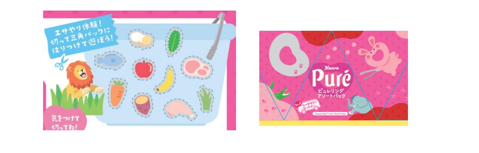 「ピュレリングアソートパック」のパッケージは、切り取って楽しむ仕掛け付き。裏面にちりばめられた野菜や果物、肉などのイラストを切り取って、グミが入ったテトラにはりつけることで描かれたどうぶつたちへのエサやり体験ができます。どのどうぶつになにをあげるのか、子どもたちの想像力を膨らませるワクワク体験をお楽しみください。