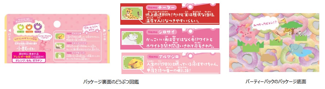また、親子でワクワク楽しみながらお召し上がりいただけるよう、各商品にさまざまな仕掛けを施しています。「ピュレリング」と「ピュレリングパーティーパック」のパッケージ裏面には、「どうぶつずかん」を掲載。表面にいるどうぶつの意外なプチ情報を紹介しています。さらに、「ピュレリングパーティーパック」の底面には動物たちが隠れているかも?「うさリン」と一緒に、“サファリ探検”を楽しんでみてはいかがでしょうか。