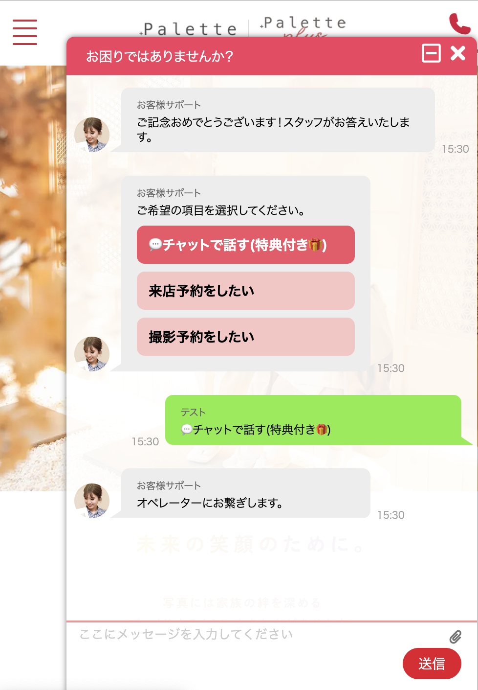三景スタジオのチャットサービスは、お客様の利便性向上を目指し、より多くの方々写真工房ぱれっと・Palette+plusをご利用いただくために導入いたしました。今後もニーズにお応えするため、サービスの拡充や改善に努めてまいります。