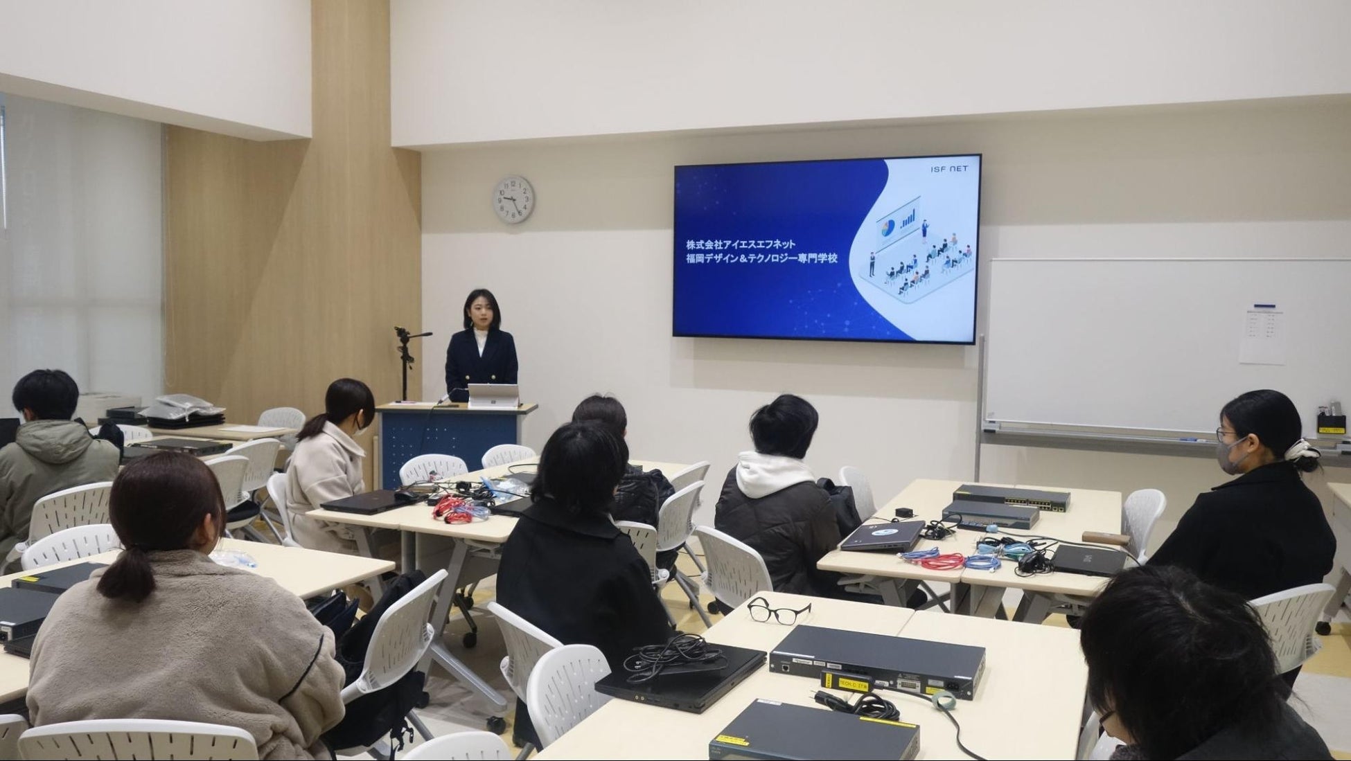 株式会社アイエスエフネット(本社:東京都港区/代表取締役:渡邉幸義、以下アイエスエフネット)は、2025年2月13・14日の日程で、福岡デザイン&テクノロジー専門学校(所在地:福岡市博多区/学校長:吉永俊嗣)にて、学生の方向けにネットワーク実機演習を実施しました。本演習は、実際のネットワーク機器を使用したハンズオン形式の演習を通じて、ITインフラエンジニアの仕事を体験できる貴重な機会として、多くの学生にご参加いただきました。