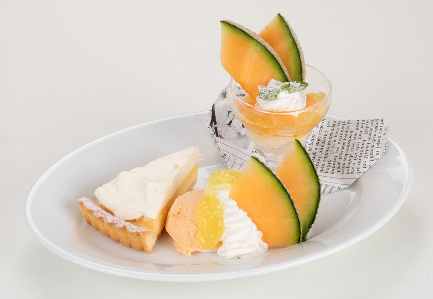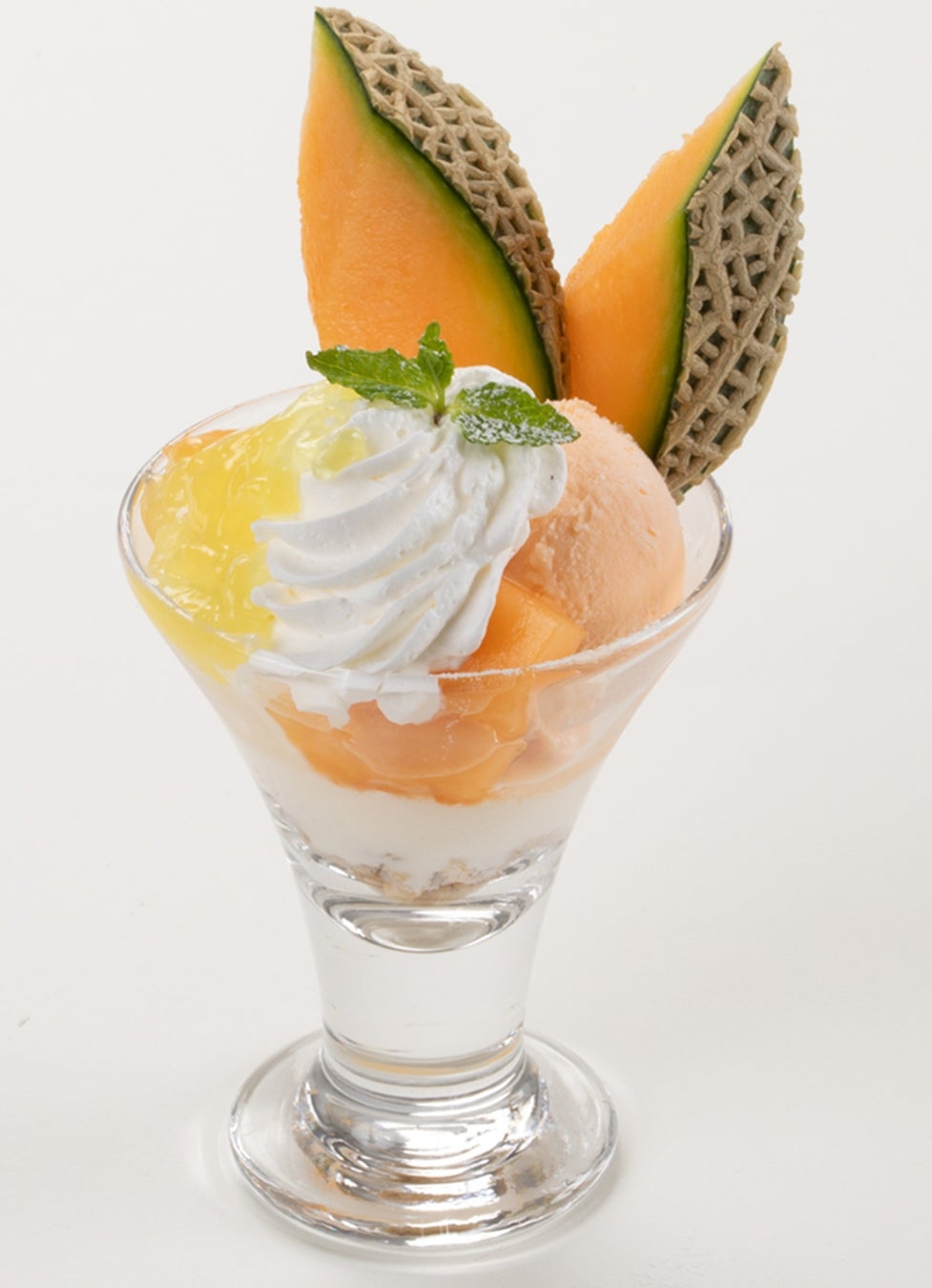 瀬戸内レモンを使用したジュレ、バニラとメロンの2種のアイスをトッピングし、贅沢にメロンを添えました。