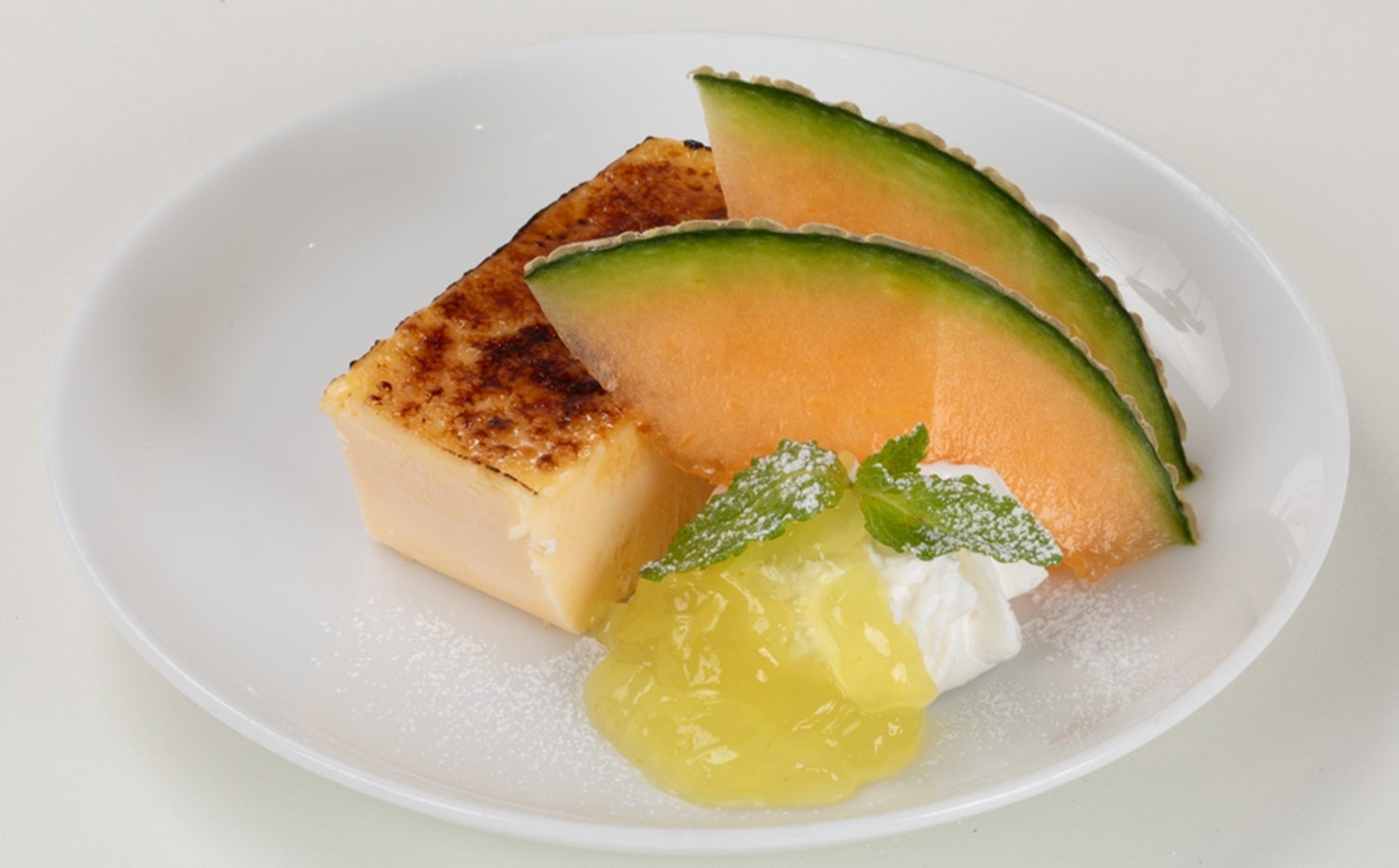 キャラメリーゼした濃厚なカタラーナに瀬戸内レモンを使用したジュレとメロンを添えました。