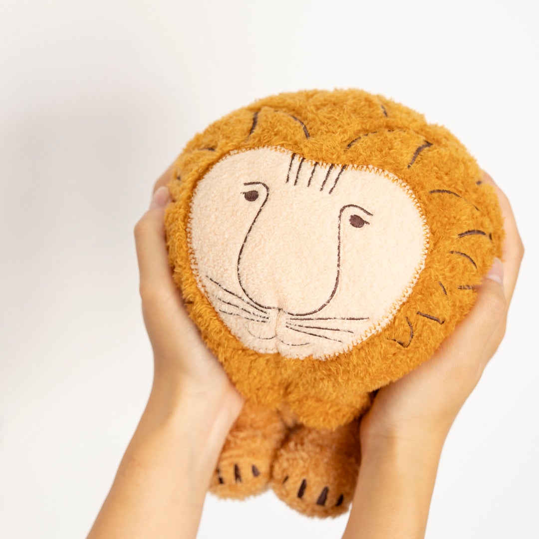 まあるいライオンの陶器そのままに、ぬいぐるみへと生まれ変わりました。中身がしっかり詰まったぬいぐるみは部位ごとに重さを調整しており、お尻部分にはビーズを入れて重さをだし、しっかり自立する設計になっています。
