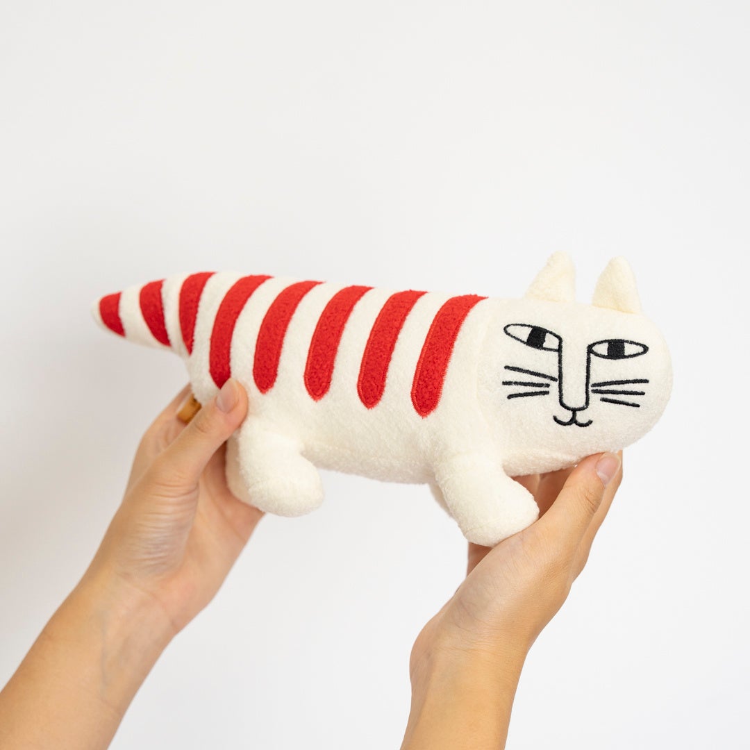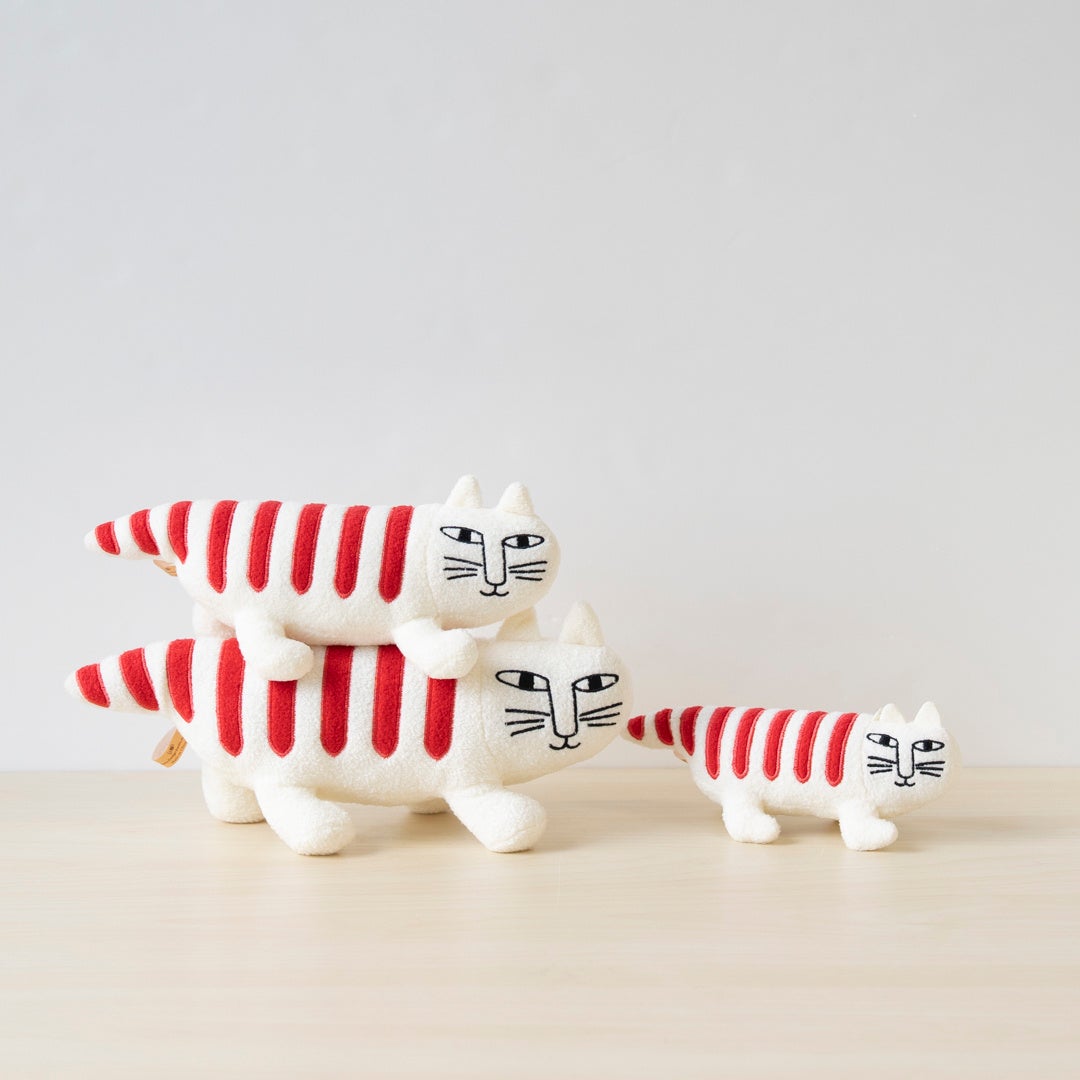 ニューバージョンでは、リサのオリジナルのイラストをぬいぐるみとしてアレンジすることから、全ての工程をゼロからやり直しました。トレードマークの真っ赤なしましまと顔の表情については、何度も試作を重ね、ニューバージョンらしい現代的なかわいらしさを目指しました。リサの陶器作品のスピリッツを汲み取り、サイズ違いで並べた時にぐっとくるバランスになるようにデザインしました。
