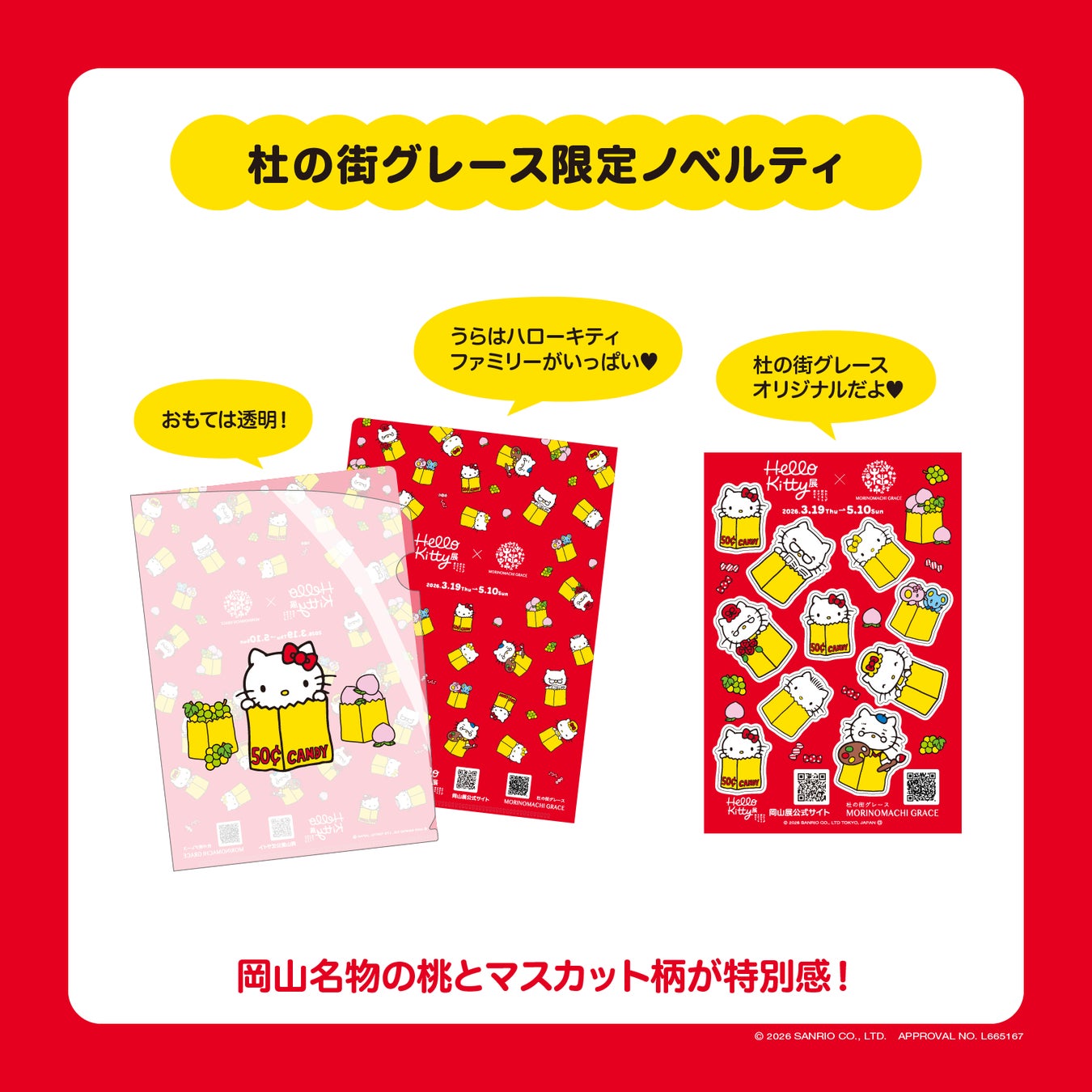 「Hello Kitty展」メインビジュアルに、岡山らしく「桃」と「マスカット」をあしらったデザインは杜の街グレースだけのオリジナル。ワークショップや館内のご利用で、限定のA5クリアファイルやシールがもらえます。※取得条件は杜の街グレース公式HPをご確認ください