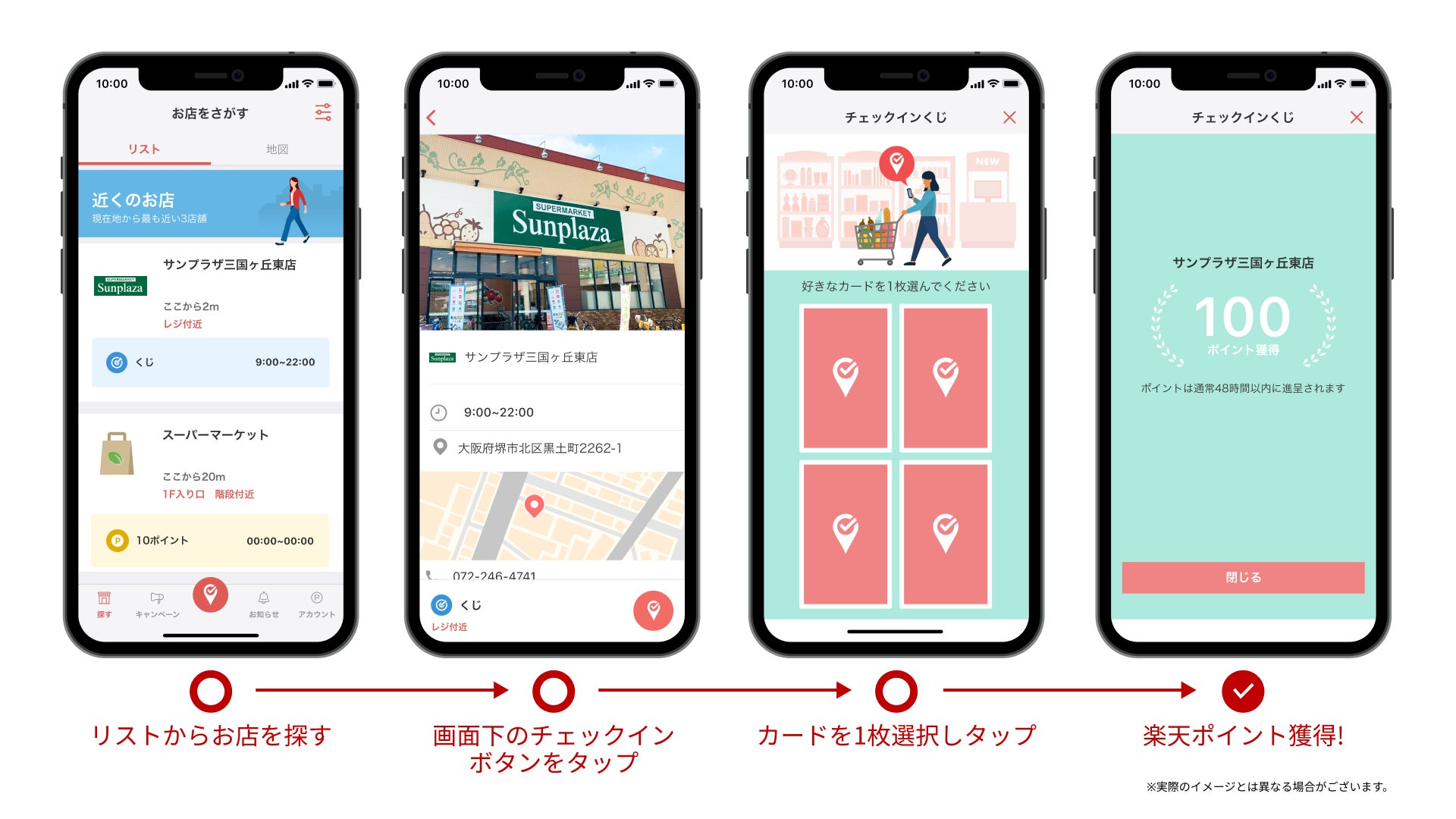 本サービス導入により、利用者は店内の指定エリアで「楽天チェック」アプリを起動しチェックインすると、くじ形式で「楽天ポイント」を最大100ポイント獲得することができます。
