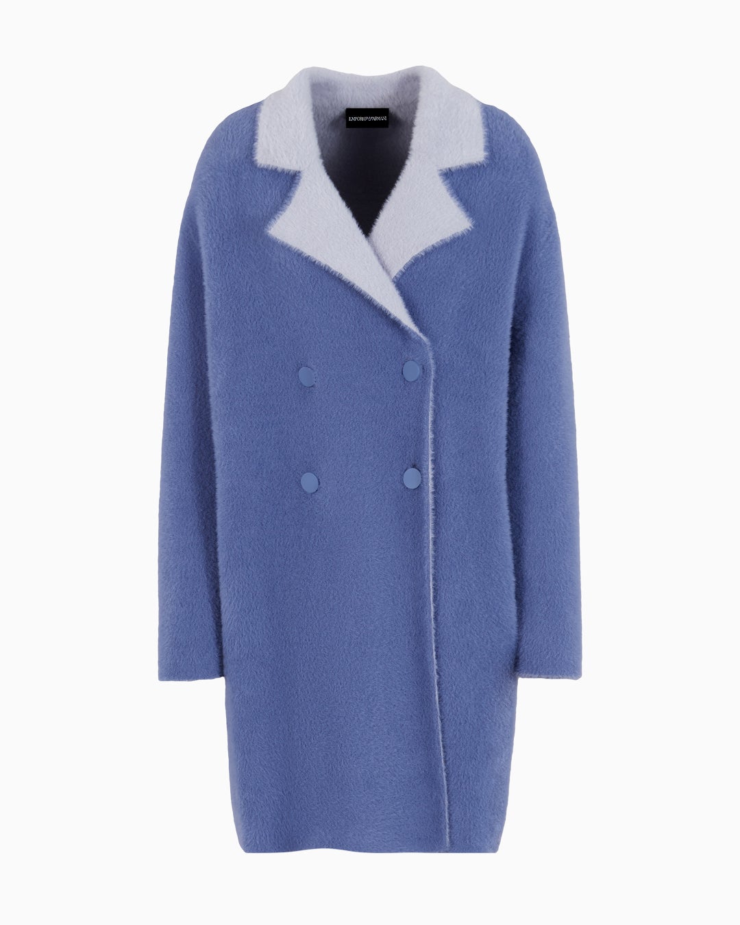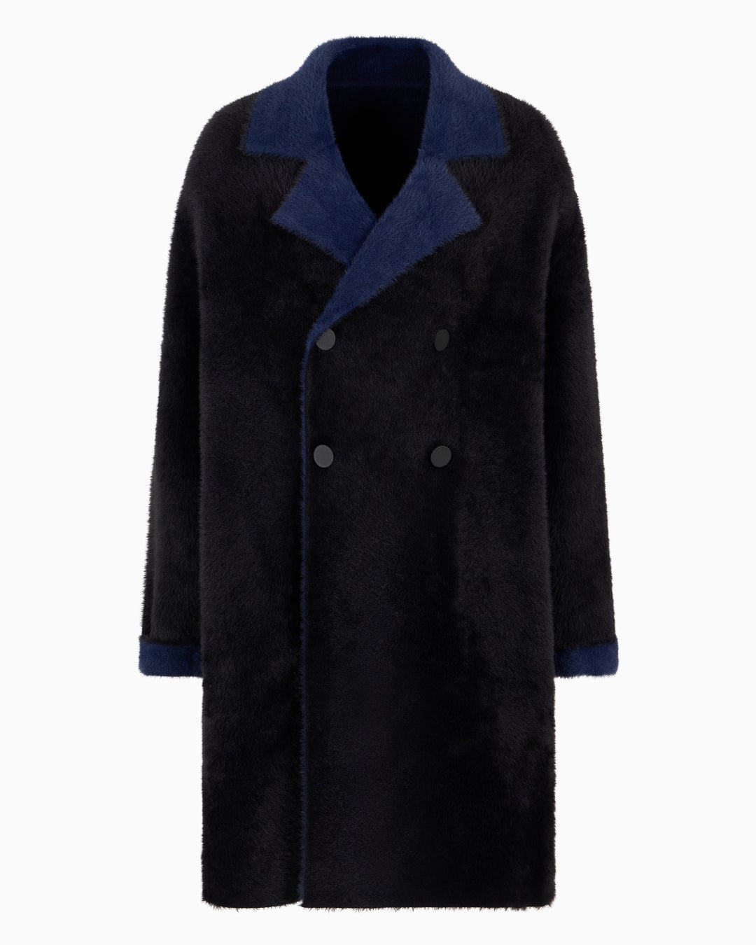 柔らかいモヘア風ファブリックで仕立てた、ラペル付きのダブルブレストコート。アウターとインナーにコントラストの効いたカラーを配したリバーシブルでご使用頂けるハーフコートです。デイリーウェアとして、さまざまなシーンで活躍します。黒とブルーのバイカラータイプは都会的なスタイルで、また、ラベンダーとオフホワイトのバイカラータイプはフェミニンな印象で冬のスタイリングを仕上げます。毛足の長いファブリックは秋冬らしく見た目にも暖かで、ソフトで軽量なので着心地も抜群です。